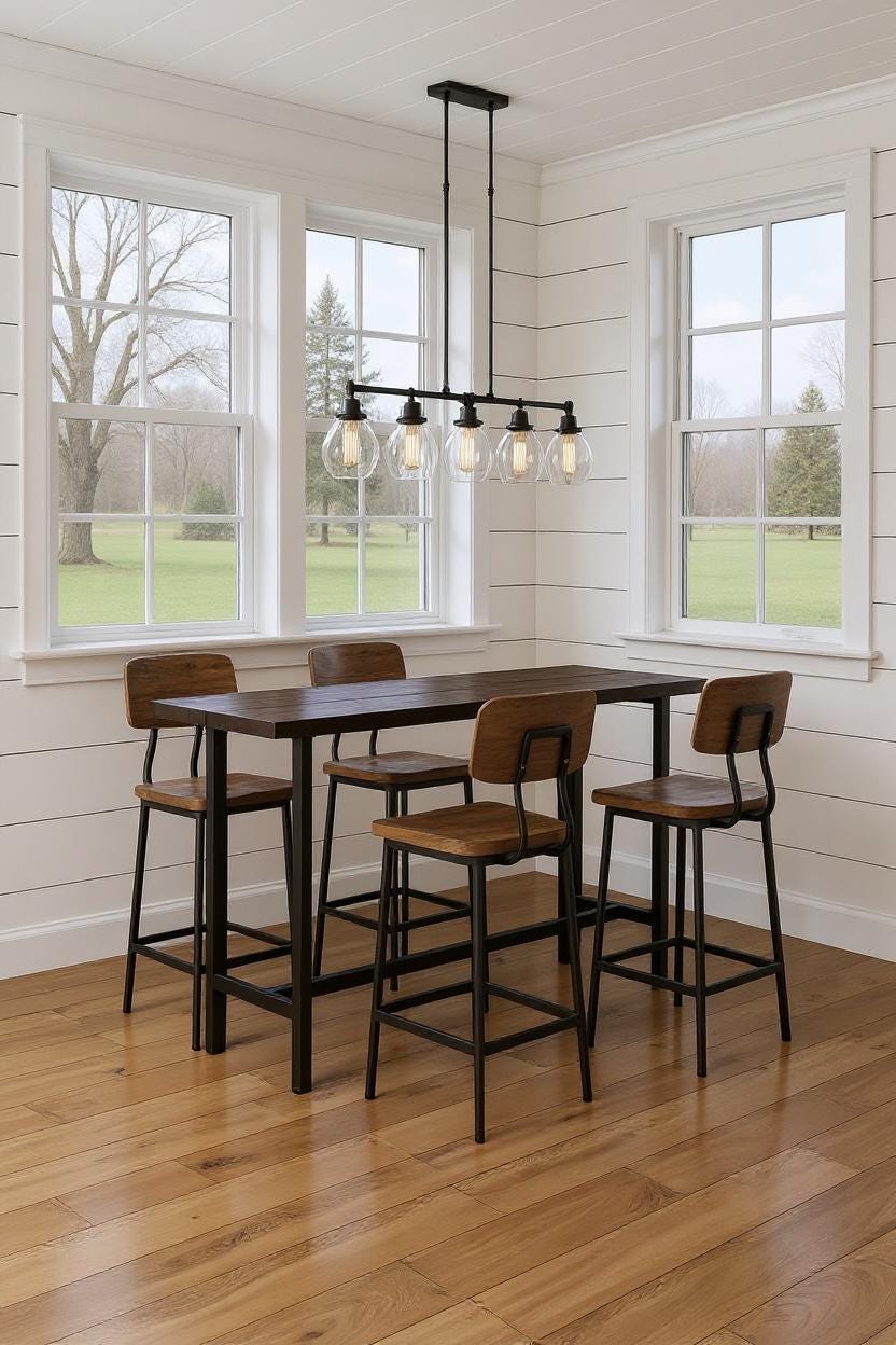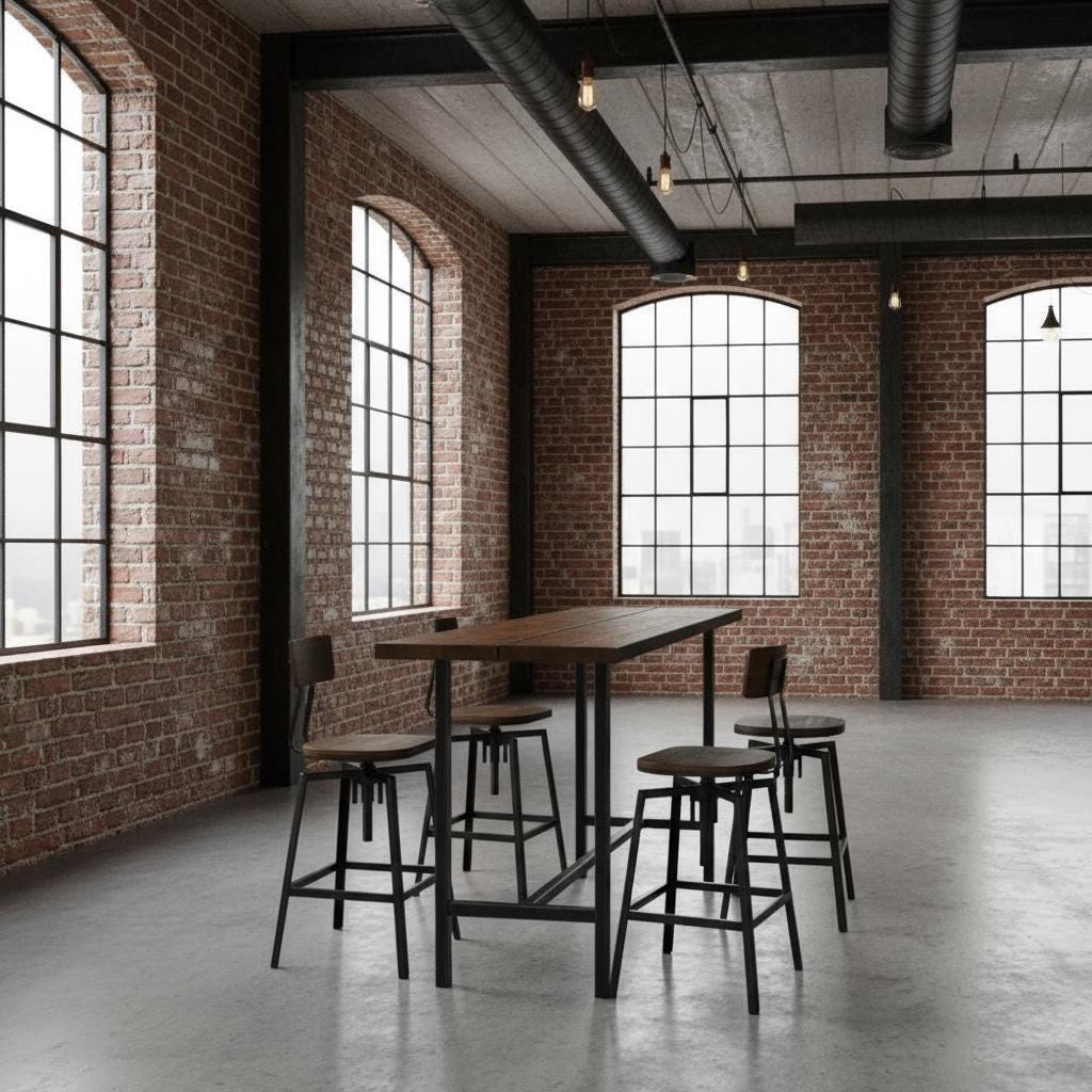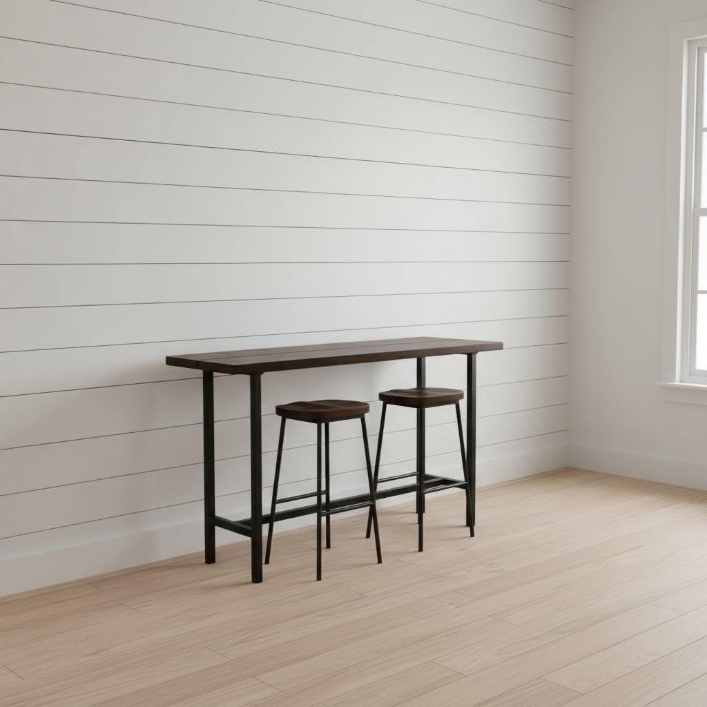 Our beautiful Industrial style Bar Table features a unique steel leg frame topped off with a thick 1.5" solid wood surface. The wood top is handcrafted from carefully selected timber, chosen for characteristics such as knots, variable grain patterns, saw marks, nail holes, dents and distressed details, as well as many other unique characteristics. Each piece is handled with care and crafted with hours of skillful labor. Like crafting a piece of artwork, the wood is sawed, shaped and sanded to form this beautiful treasure. The surface also features approximately one-half inch V-shaped grooves along each joined board edge to provide a rustic plank board feel and appearance. A full array of rich finishes and colors are available for your choosing. All finishes are hand applied and top coated with a water based environmentally friendly polyurethane. Order your very own piece of handcrafted TRUMAKE™ furniture today!