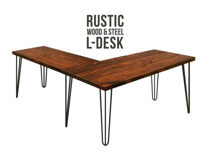 • TRUMAKE™ RUSTIC WOOD & STEEL L-SHAPED DESK ★★★★★ Our beautiful Rustic Wood L-Shaped Desk features a unique steel leg frame topped off with a thick 1.5" solid wood surface.