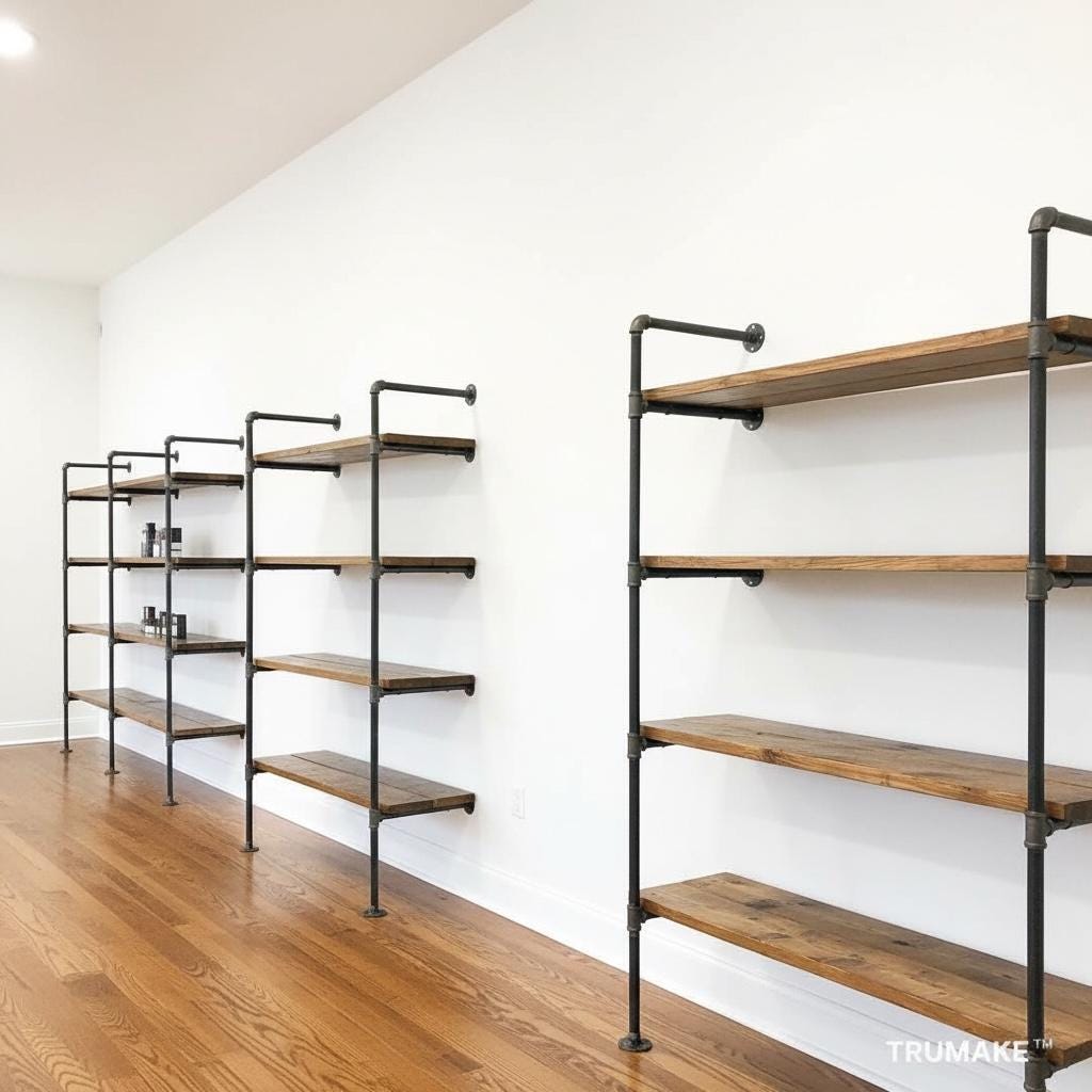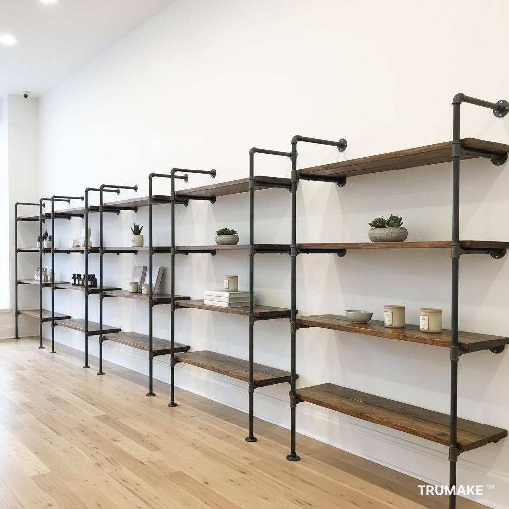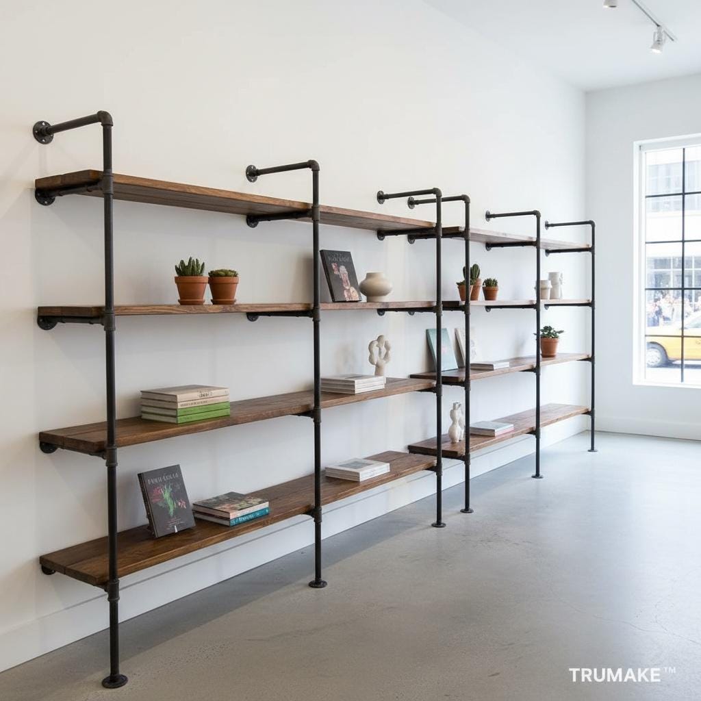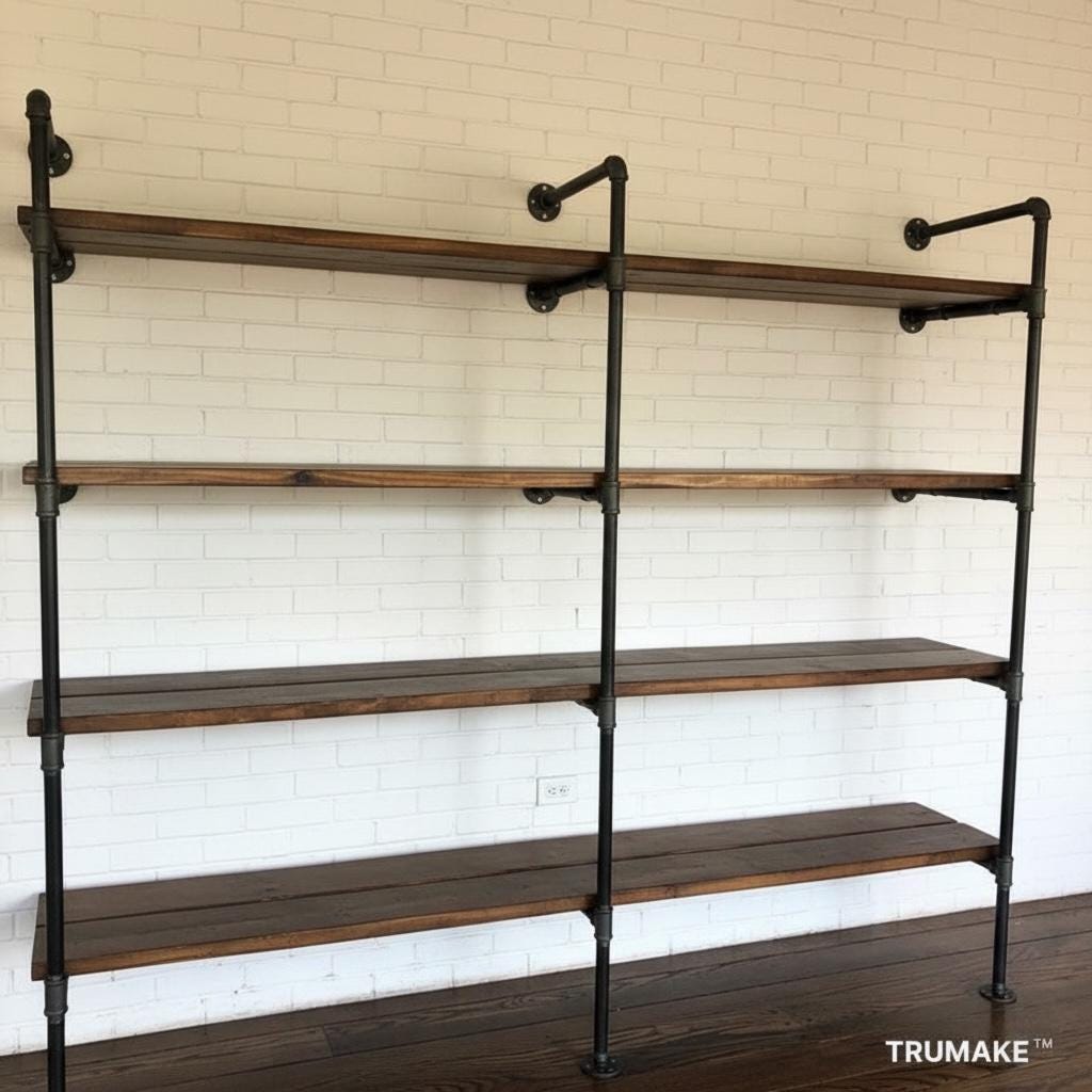 Our Wall Shelving Unit features industrial steel pipe with thick solid wood shelving. The rough-sawn wood is handcrafted from carefully selected timber, chosen for characteristics such as knots, variable grain patterns, saw marks, nail holes, dents and distressed details, as well as many other unique characteristics.