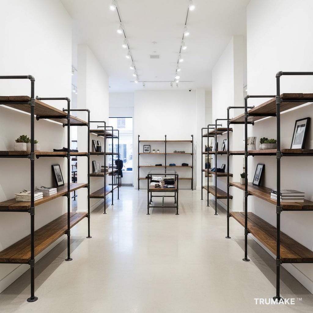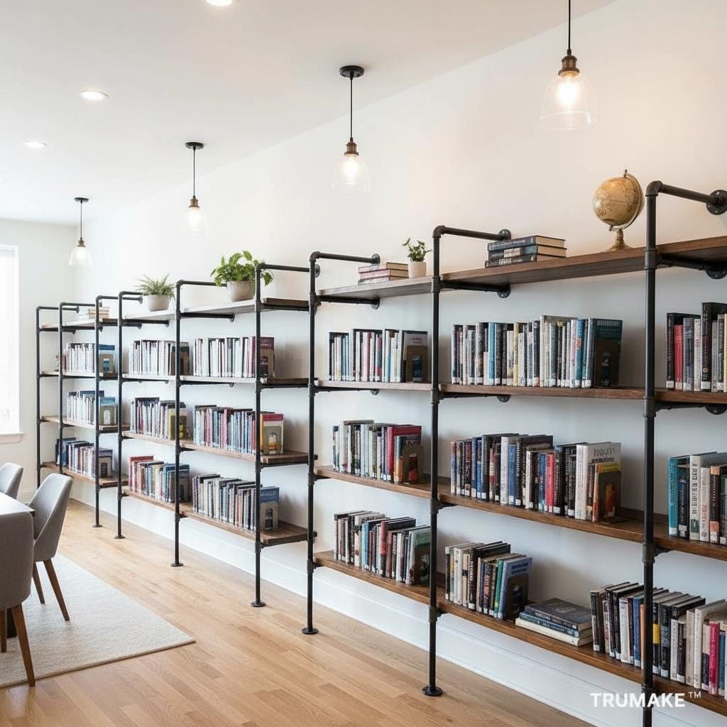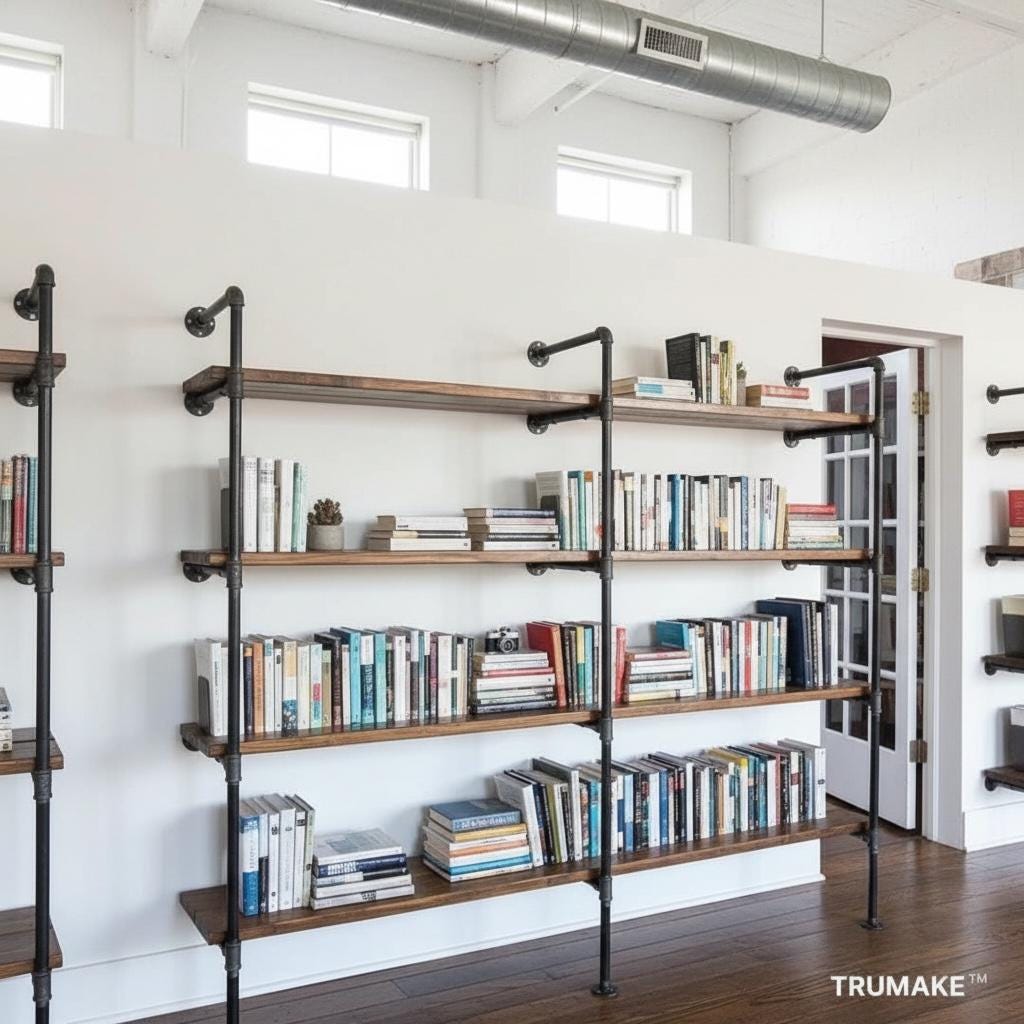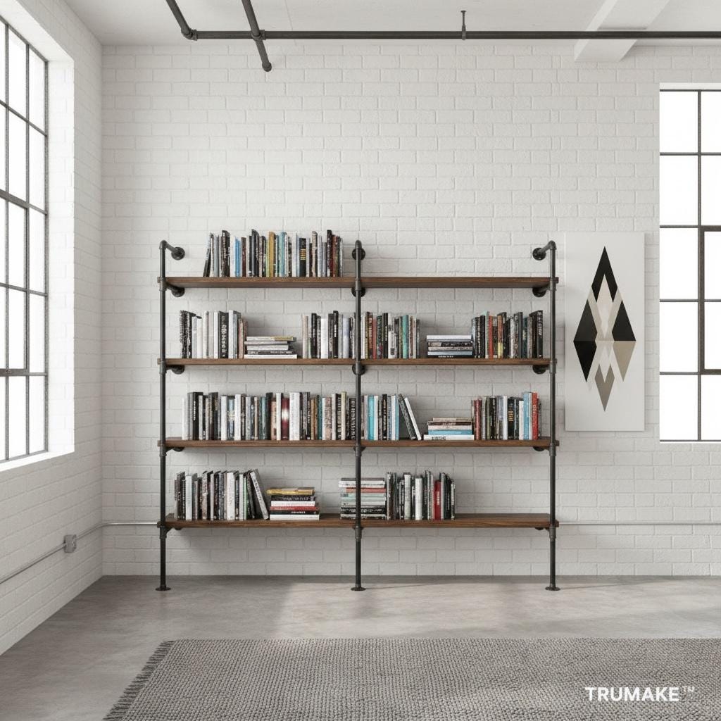 Our Wall Shelving Unit features industrial steel pipe with thick solid wood shelving. The rough-sawn wood is handcrafted from carefully selected timber, chosen for characteristics such as knots, variable grain patterns, saw marks, nail holes, dents and distressed details, as well as many other unique characteristics.