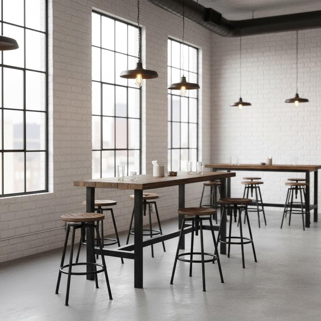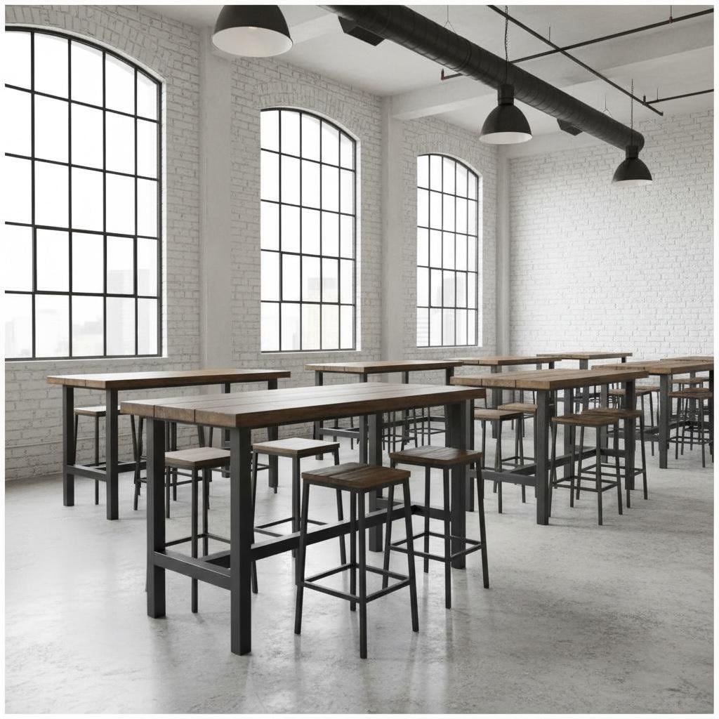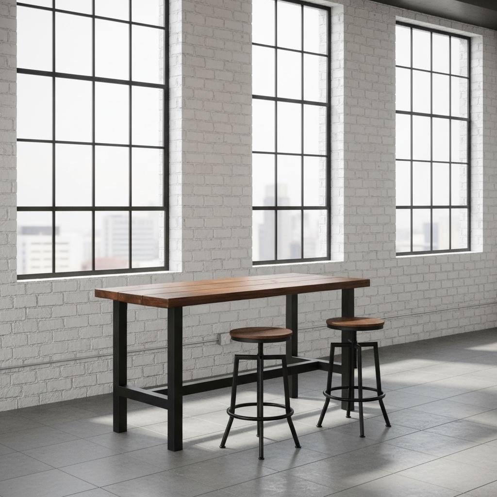 Our beautiful Industrial style Bar Table features a unique steel leg frame topped off with a thick 1.5" solid wood surface.