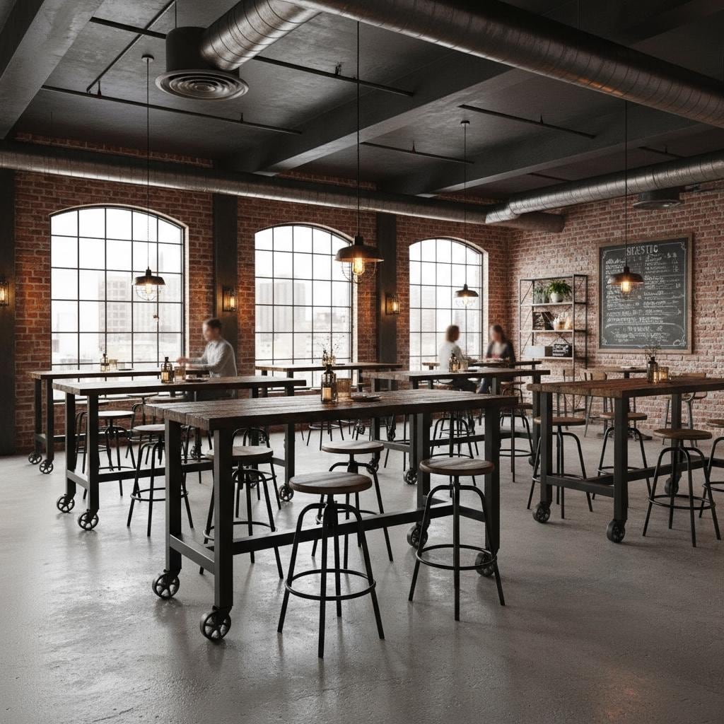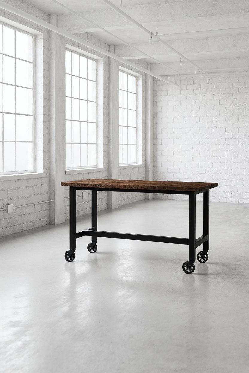• RUSTIC WOOD & STEEL BAR TABLE with Locking Caster Wheels