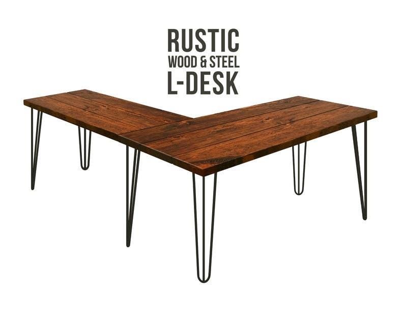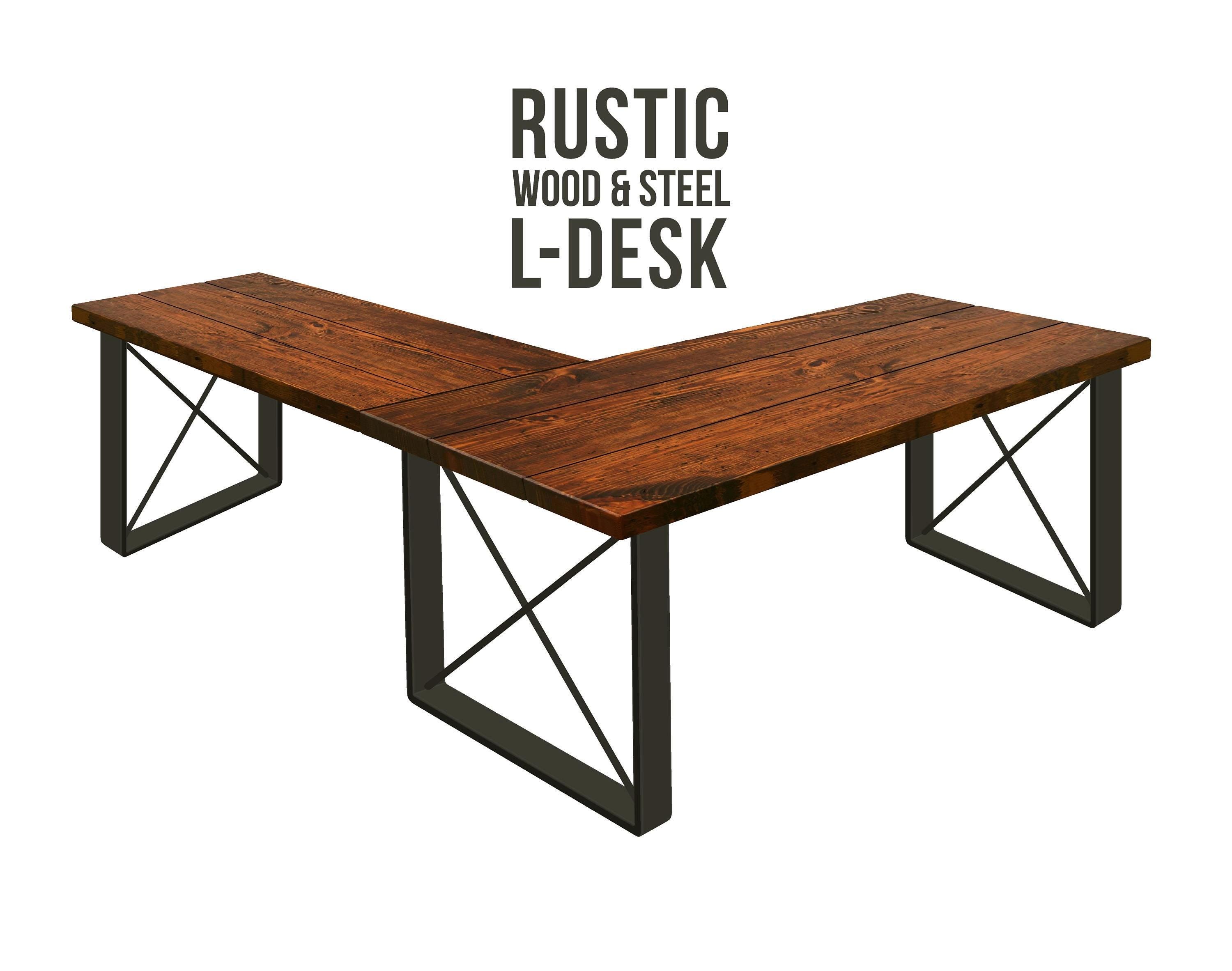 • TRUMAKE™ RUSTIC WOOD & STEEL L-SHAPED DESK ★★★★★ Our beautiful Rustic Wood L-Shaped Desk features a unique steel leg frame topped off with a thick 1.5" solid wood surface.