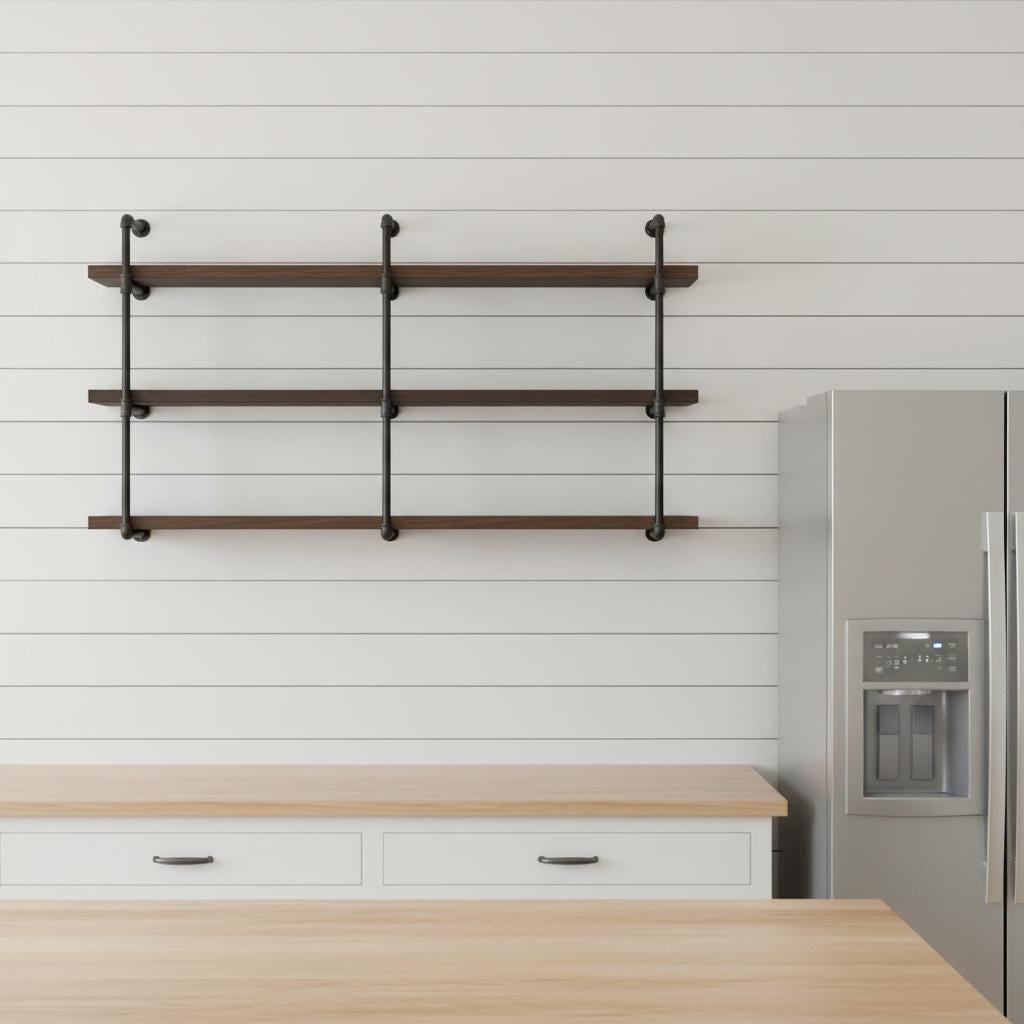 Our Wall Shelving Unit features industrial steel pipe with thick solid wood shelving. The rough-sawn wood is handcrafted from carefully selected timber, chosen for characteristics such as knots, variable grain patterns, saw marks, nail holes, dents and distressed details, as well as many other unique characteristics.