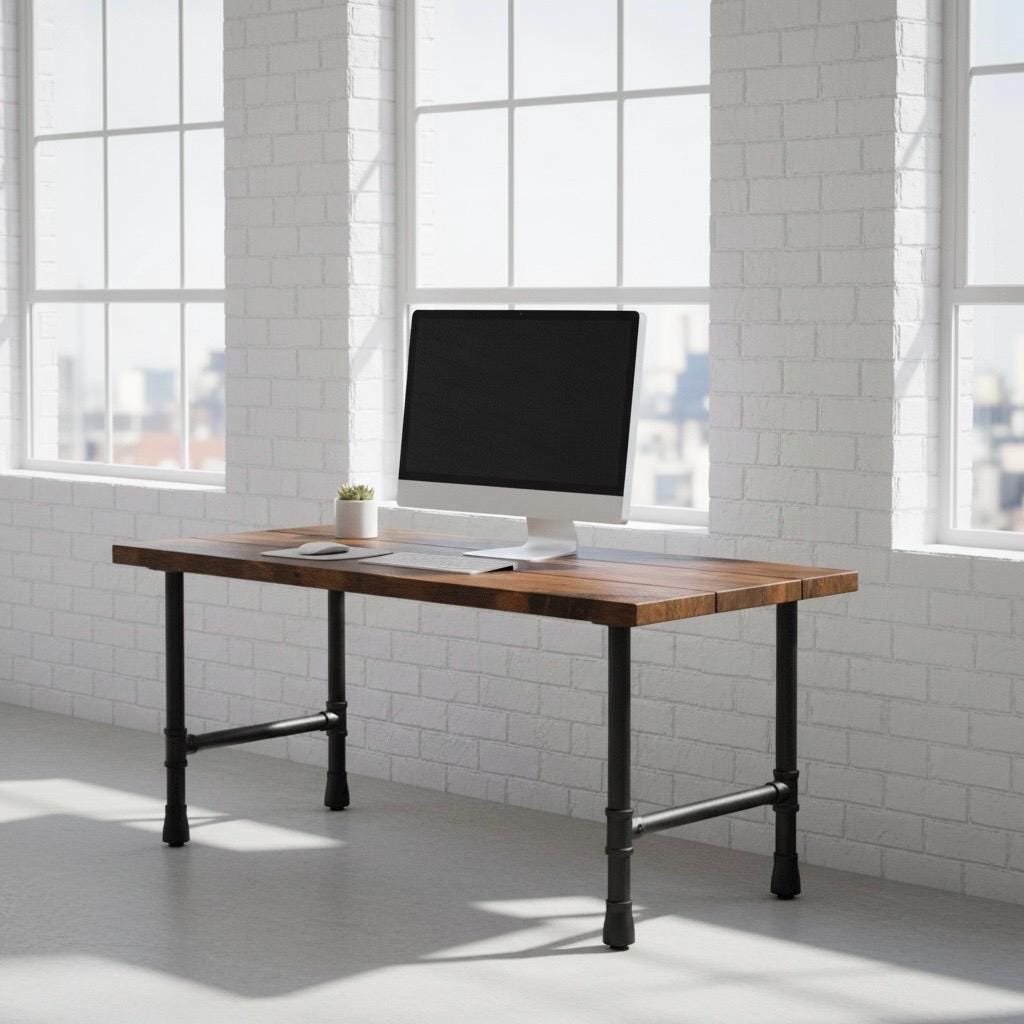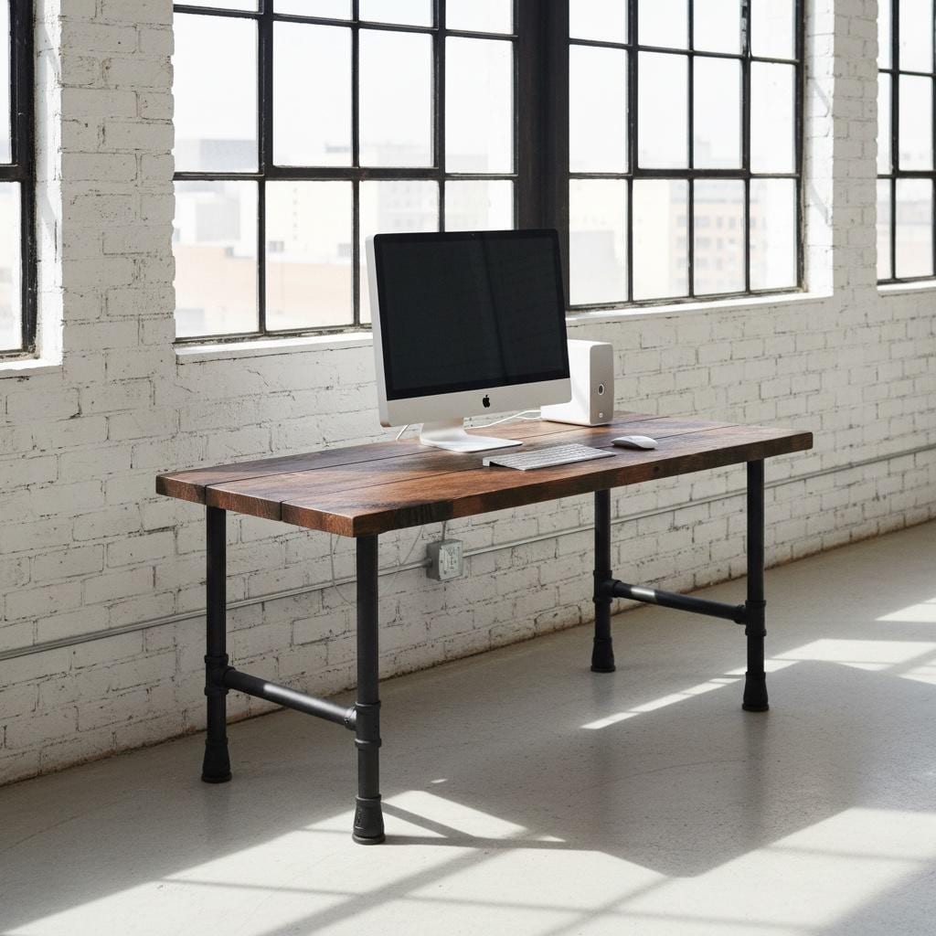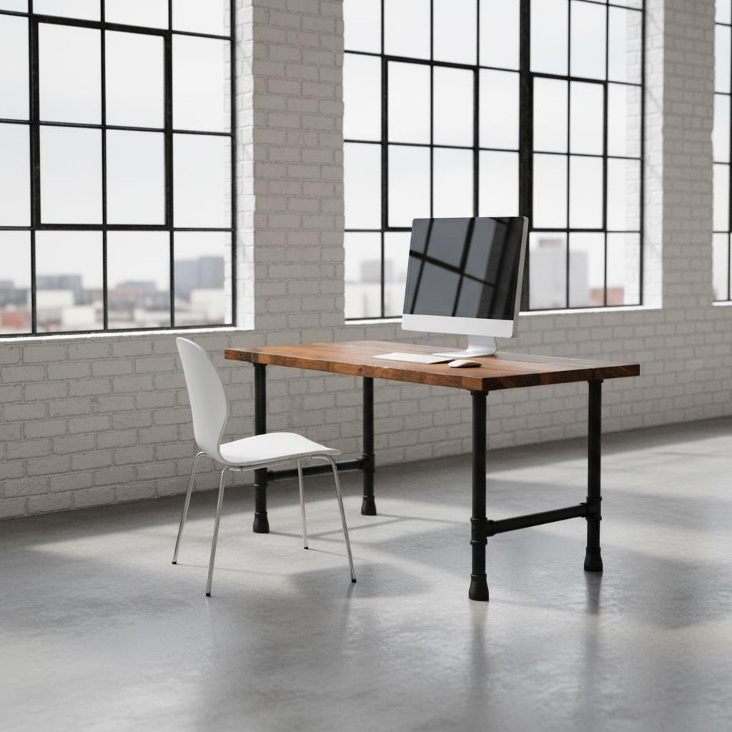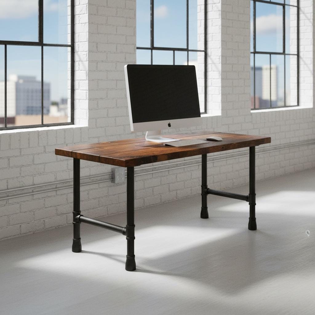 Our beautiful Desk features industrial steel pipe legs topped off with a thick solid wood surface. The rough sawn wood top is handcrafted from carefully selected timber, chosen for characteristics such as knots, variable grain patterns, saw marks, nail holes, dents and distressed details, as well as many other unique characteristics.