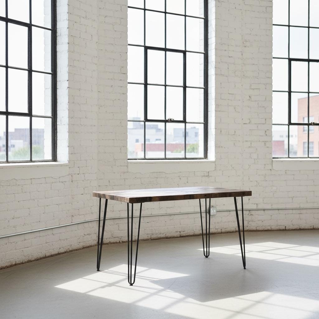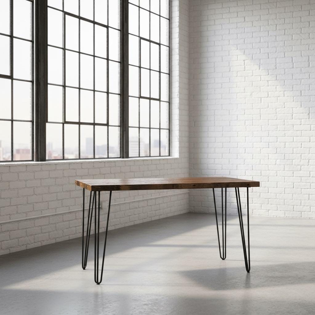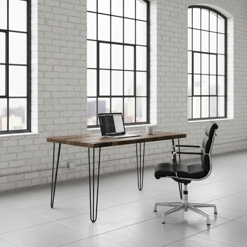This beautiful Desk features industrial steel hairpin style legs topped off with a thick solid wood surface. The rough sawn wood top is handcrafted from carefully selected timber, chosen for characteristics such as knots, variable grain patterns, saw marks, nail holes, dents and distressed details, as well as many other unique characteristics.