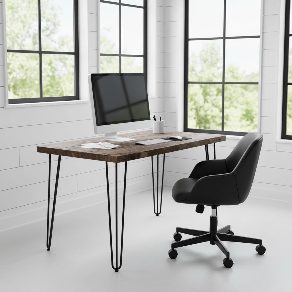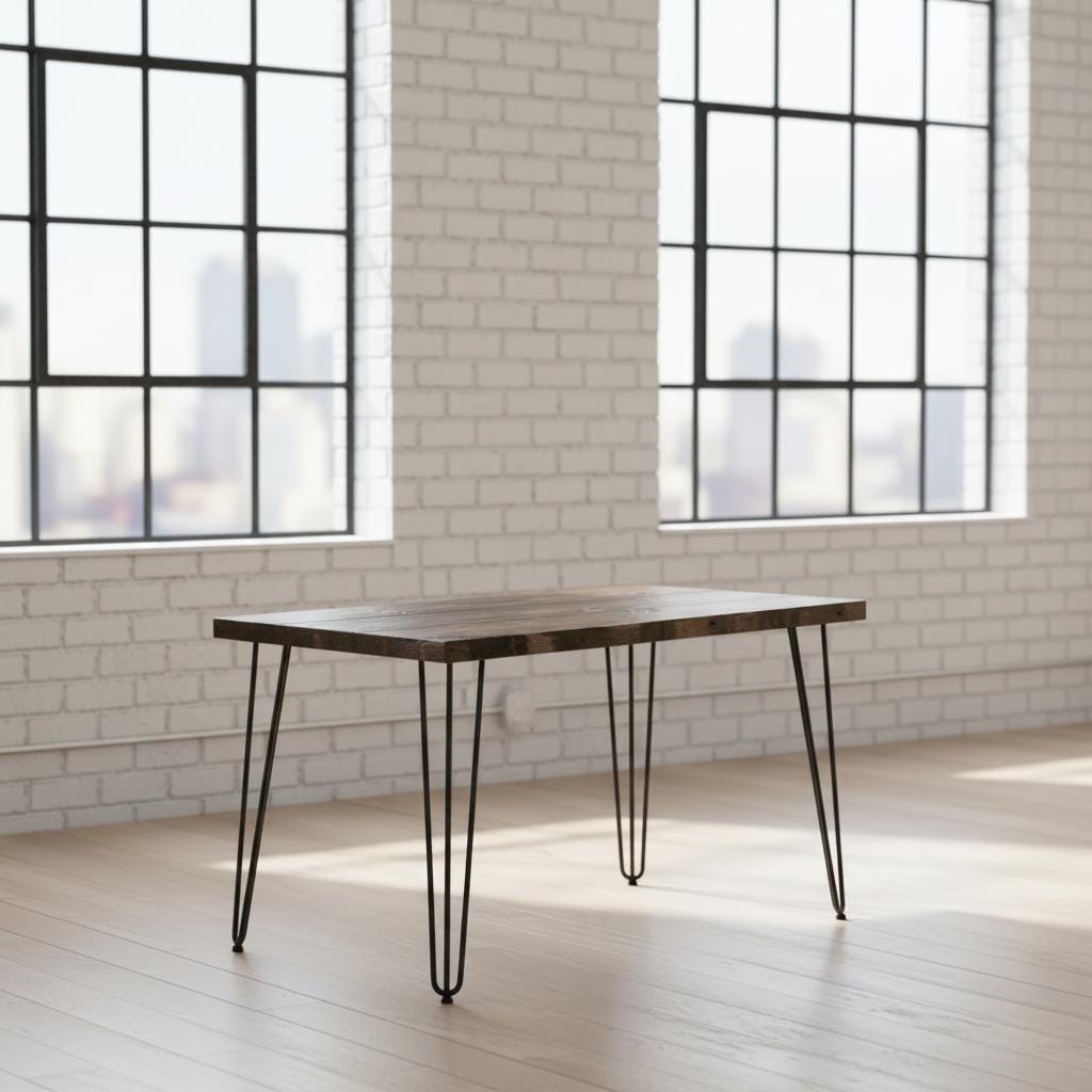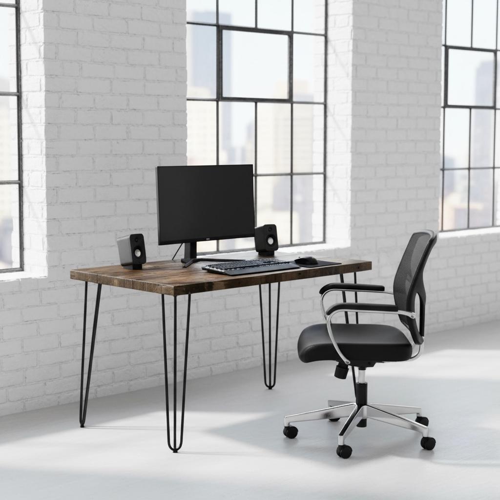 This beautiful Desk features industrial steel hairpin style legs topped off with a thick solid wood surface. The rough sawn wood top is handcrafted from carefully selected timber, chosen for characteristics such as knots, variable grain patterns, saw marks, nail holes, dents and distressed details, as well as many other unique characteristics.