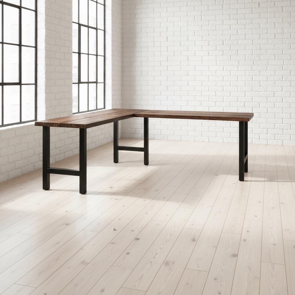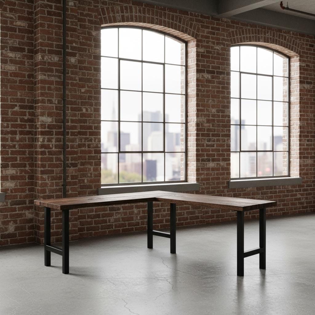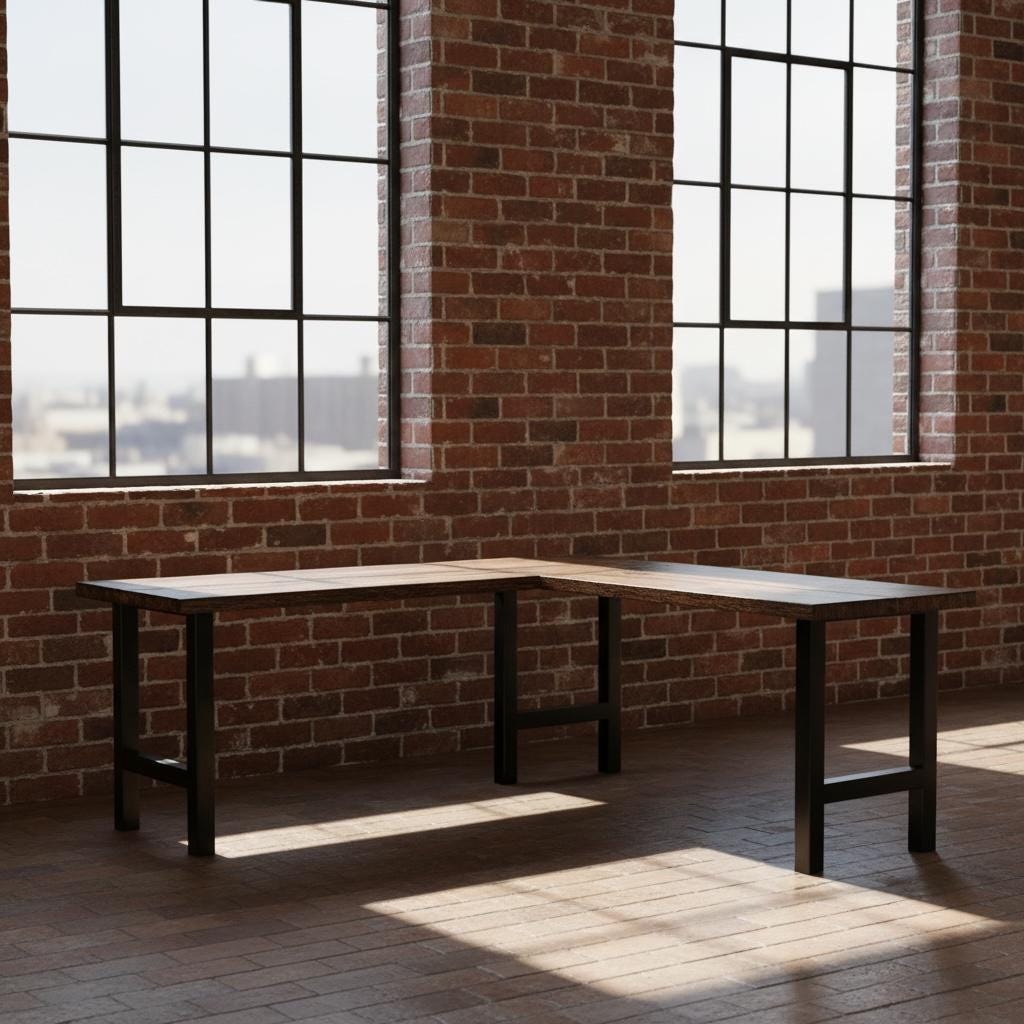 This beautiful Rustic Wood L-Shaped Desk features a unique steel leg frame topped off with a thick 1.5" solid wood surface.