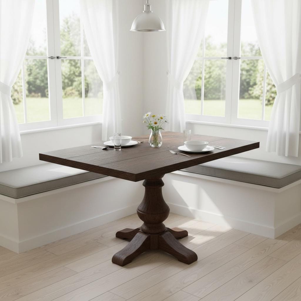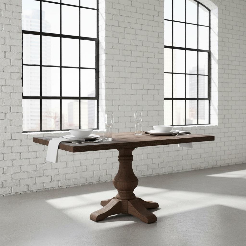 This beautiful Rustic Wood Table features solid wood pedestal leg with a thick 1.5" solid wood surface. The table top is handcrafted from carefully selected timber, chosen for characteristics such as knots, variable grain patterns, saw marks, nail holes, dents and distressed details, as well as many other unique characteristics.