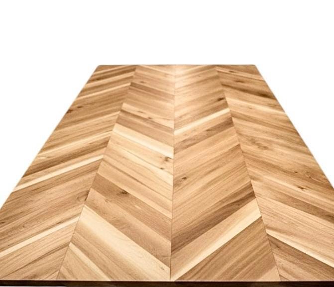 This beautiful Chevron Style Wood Desk features unique steel legs topped off with a thick 1.5" solid wood surface. The top is handcrafted from carefully selected timber, chosen for characteristics such as knots, variable grain patterns, and many other unique characteristics. Each piece is handled with care and crafted with hours of skillful labor. Like crafting a piece of artwork, the wood is sawed, shaped and sanded to form this beautiful treasure. All finishes are hand applied and top coated with a water based polyurethane. Order your very own piece of handcrafted furniture today!