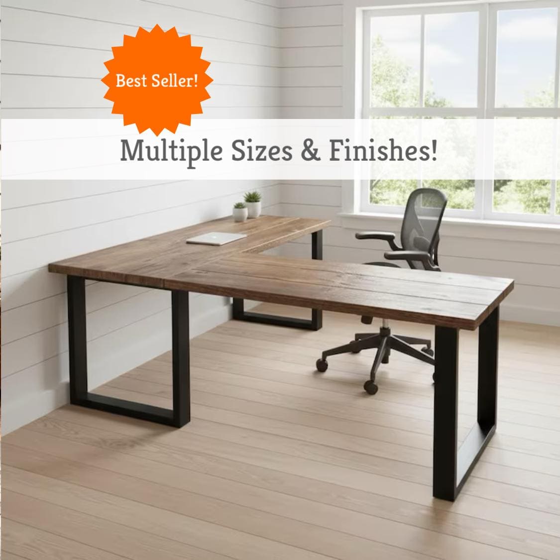 Our beautiful Rustic Wood L-Shaped Desk features a unique steel leg frame topped off with a thick 1.5" solid wood surface. The desk top is handcrafted from carefully selected timber, chosen for characteristics such as knots, variable grain patterns, saw marks, nail holes, dents and distressed details, as well as many other unique characteristics. Each piece is handled with care and crafted with hours of skillful labor. Like crafting a piece of artwork, the wood is sawed, shaped and sanded to form this beautiful treasure. The surface also features approximately one-half inch V-shaped grooves along each joined board edge to provide a rustic plank board feel and appearance. A full array of rich finishes and colors are available for your choosing. All finishes are hand applied and top coated with a water based polyurethane. Order your very own piece of handcrafted TRUMAKE™ furniture today!