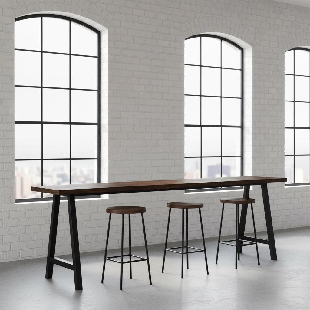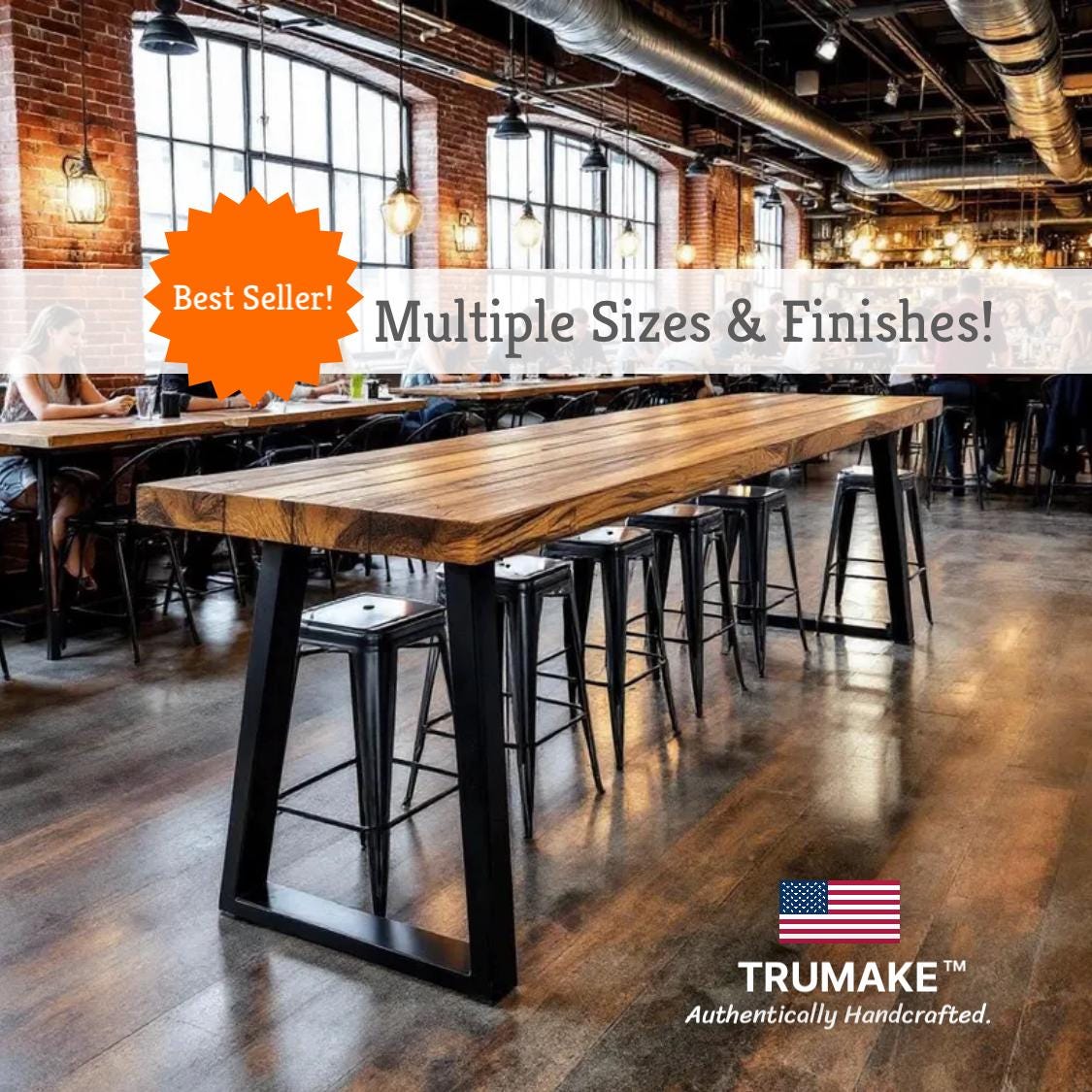 Our beautiful Industrial style Bar Table features a unique steel leg frame topped off with a thick 1.5" solid wood surface. The desk top is handcrafted from carefully selected timber, chosen for characteristics such as knots, variable grain patterns, saw marks, nail holes, dents and distressed details, as well as many other unique characteristics. Each piece is handled with care and crafted with hours of skillful labor. Like crafting a piece of artwork, the wood is sawed, shaped and sanded to form this beautiful treasure. The surface also features approximately one-half inch V-shaped grooves along each joined board edge to provide a rustic plank board feel and appearance. A full array of rich finishes and colors are available for your choosing. All finishes are hand applied and top coated with a water based environmentally friendly polyurethane. Order your very own piece of handcrafted TRUMAKE™ furniture today!