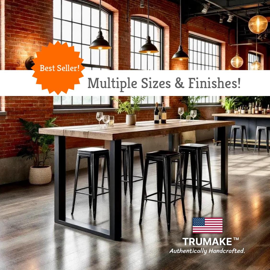 Our beautiful Industrial style Bar Table features a unique steel leg frame topped off with a thick 1.5" solid wood surface. The table top is handcrafted from carefully selected timber, chosen for characteristics such as knots, variable grain patterns, saw marks, nail holes, dents and distressed details, as well as many other unique characteristics. Each piece is handled with care and crafted with hours of skillful labor. Like crafting a piece of artwork, the wood is sawed, shaped and sanded to form this beautiful treasure. The surface also features approximately one-half inch V-shaped grooves along each joined board edge to provide a rustic plank board feel and appearance. A full array of rich finishes and colors are available for your choosing. All finishes are hand applied and top coated with a water based environmentally friendly polyurethane. Order your very own piece of handcrafted TRUMAKE™ furniture today!