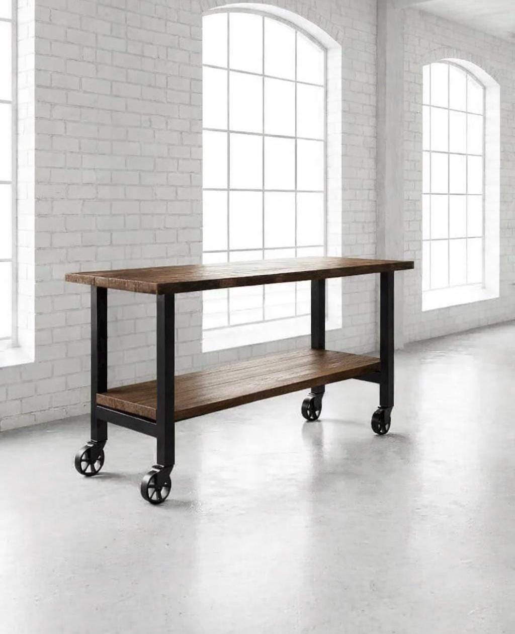 • RUSTIC WOOD & STEEL BAR TABLE with Locking Caster Wheels