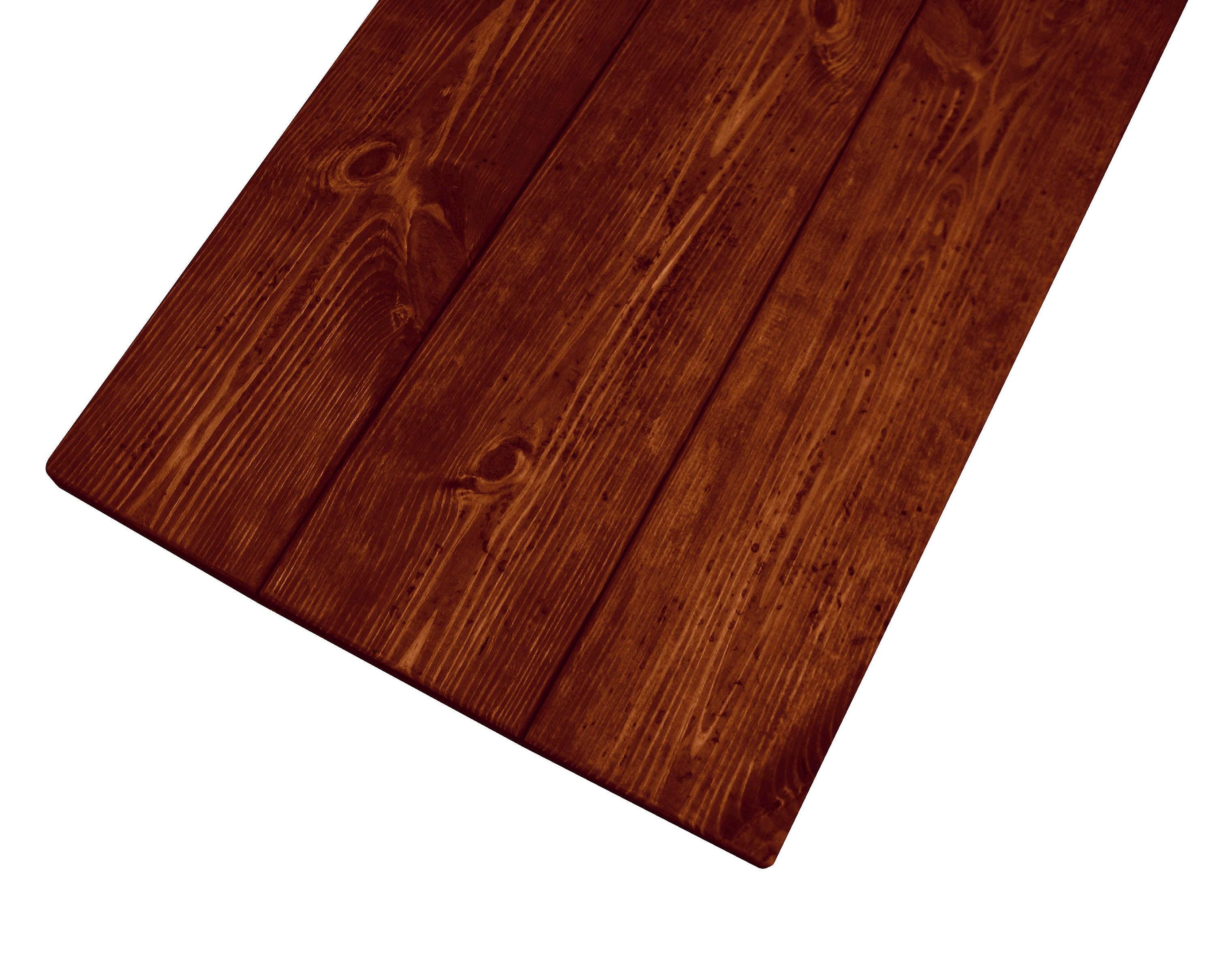 All finishes are hand applied and top coated with an environmentally-friendly water based polyurethane. Surface includes half-inch V-shaped grooves at each board seam to provide a rustic plank board feel and appearance. The following characteristics are considered acceptable and iconic to the appearance, nature and use of our products: distressing, saw blade or tool marks, nail holes, impressions & dents, lose knots or holes, scratches, cupping, warping, bow, uneven boards, weathering, mineral staining, discoloration, cracks or splitting, rust, blotches, sap, color changes, wood tone or stain color variations, grain or species variations. Characteristics vary within each item and are not guaranteed in exacting appearance in every product.