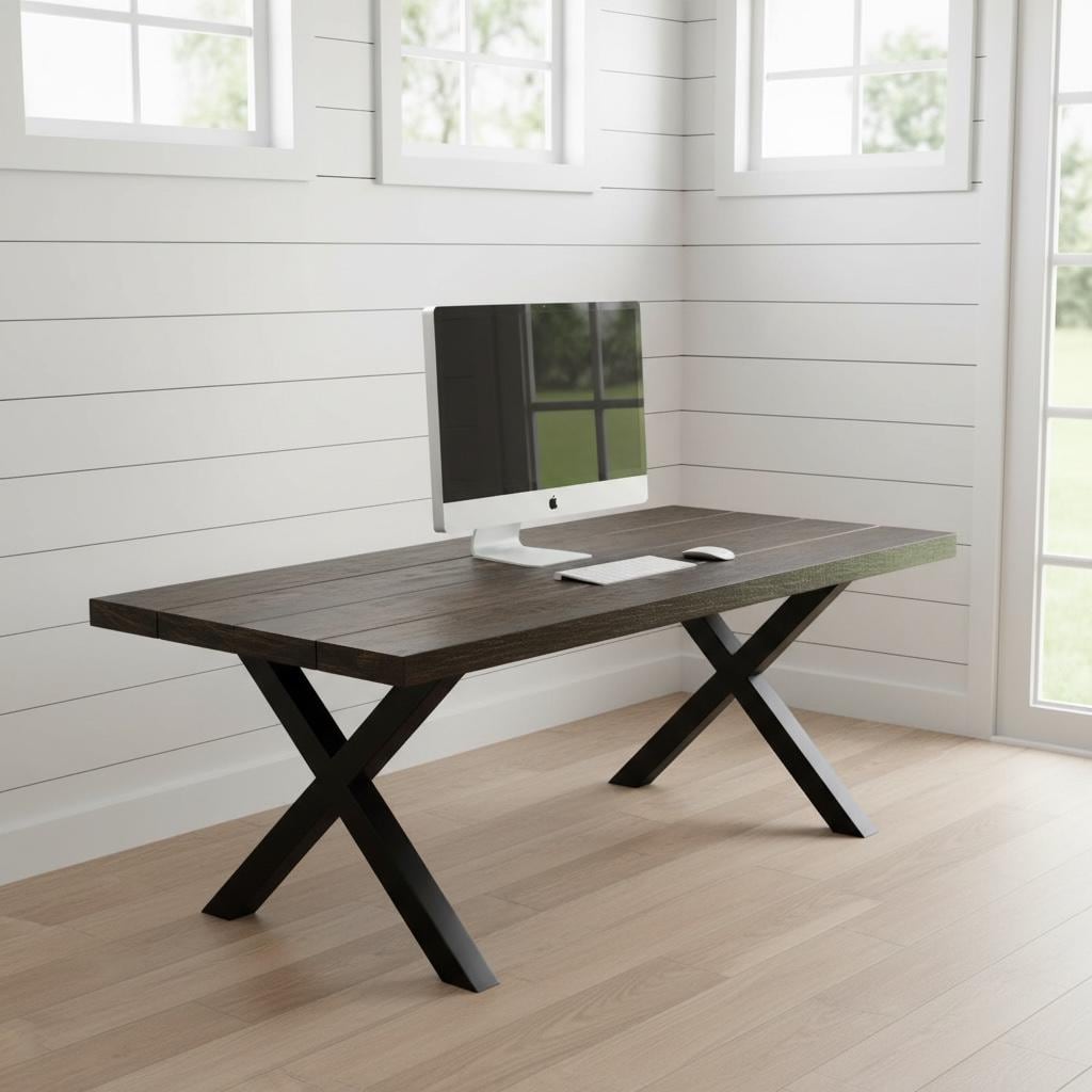 This beautiful Rustic Wood Desk features a unique steel leg frame topped off with a thick 1.5" solid wood surface. The desk top is handcrafted from carefully selected timber, chosen for characteristics such as knots, variable grain patterns, saw marks, nail holes, dents and distressed details, as well as many other unique characteristics. Each piece is handled with care and crafted with hours of skillful labor. Like crafting a piece of artwork, the wood is sawed, shaped and sanded to form this beautiful treasure. The surface also features approximately one-half inch V-shaped grooves along each joined board edge to provide a rustic plank board feel and appearance. A full array of rich finishes and colors are available for your choosing. All finishes are hand applied and top coated with a water based polyurethane. Order your very own piece of handcrafted furniture today!