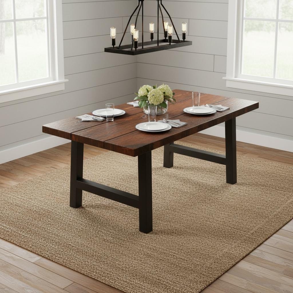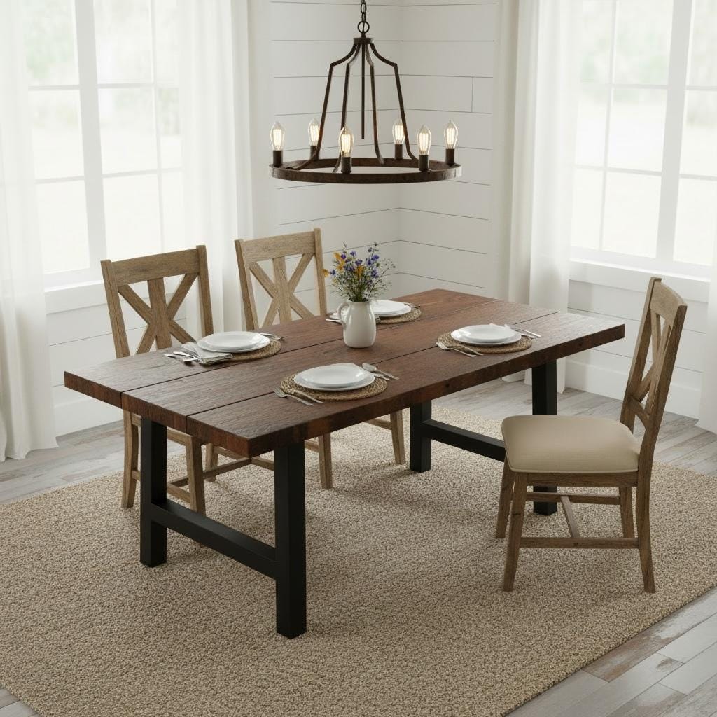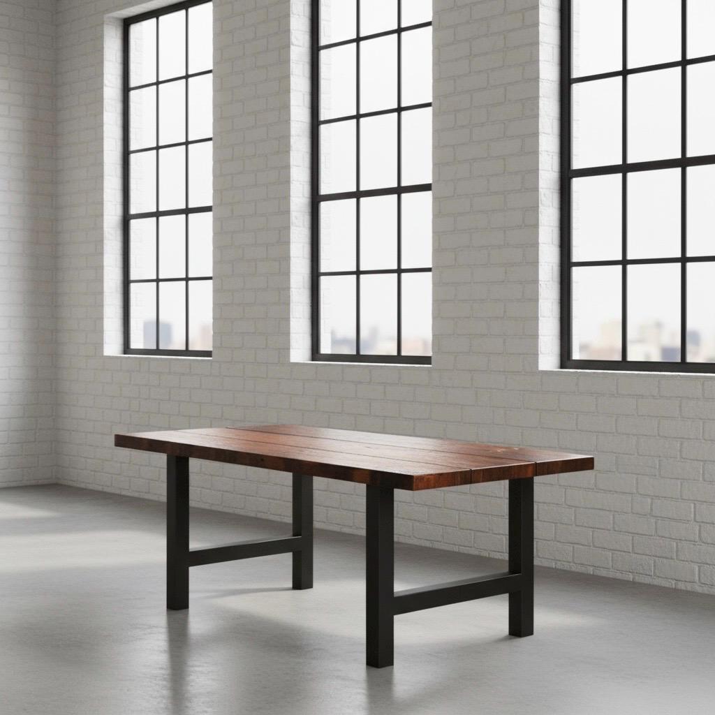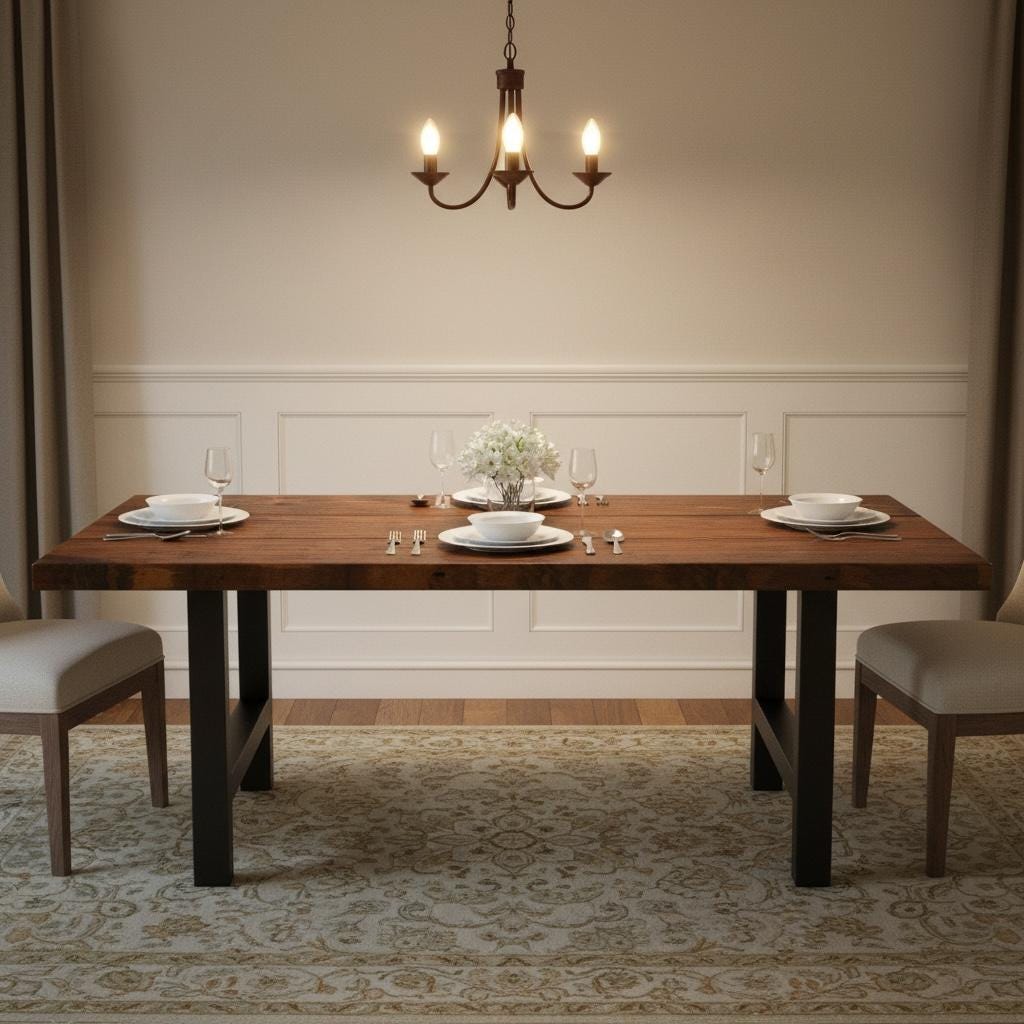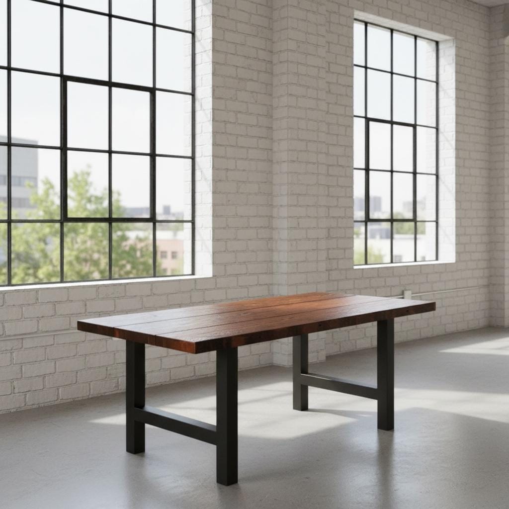 This beautiful Rustic Wood Table features unique steel legs topped off with a thick 1.5" solid wood surface. The wood top is handcrafted from carefully selected timber, chosen for characteristics such as knots, variable grain patterns, saw marks, nail holes, dents and distressed details, as well as many other unique characteristics. Each piece is handled with care and crafted with hours of skillful labor. Like crafting a piece of artwork, the wood is sawed, shaped and sanded to form this beautiful treasure. The surface also features approximately one-half inch V-shaped grooves along each joined board edge to provide a rustic plank board feel and appearance. A full array of rich finishes and colors are available for your choosing. All finishes are hand applied and top coated with a water based polyurethane. Order your very own piece of handcrafted furniture today!