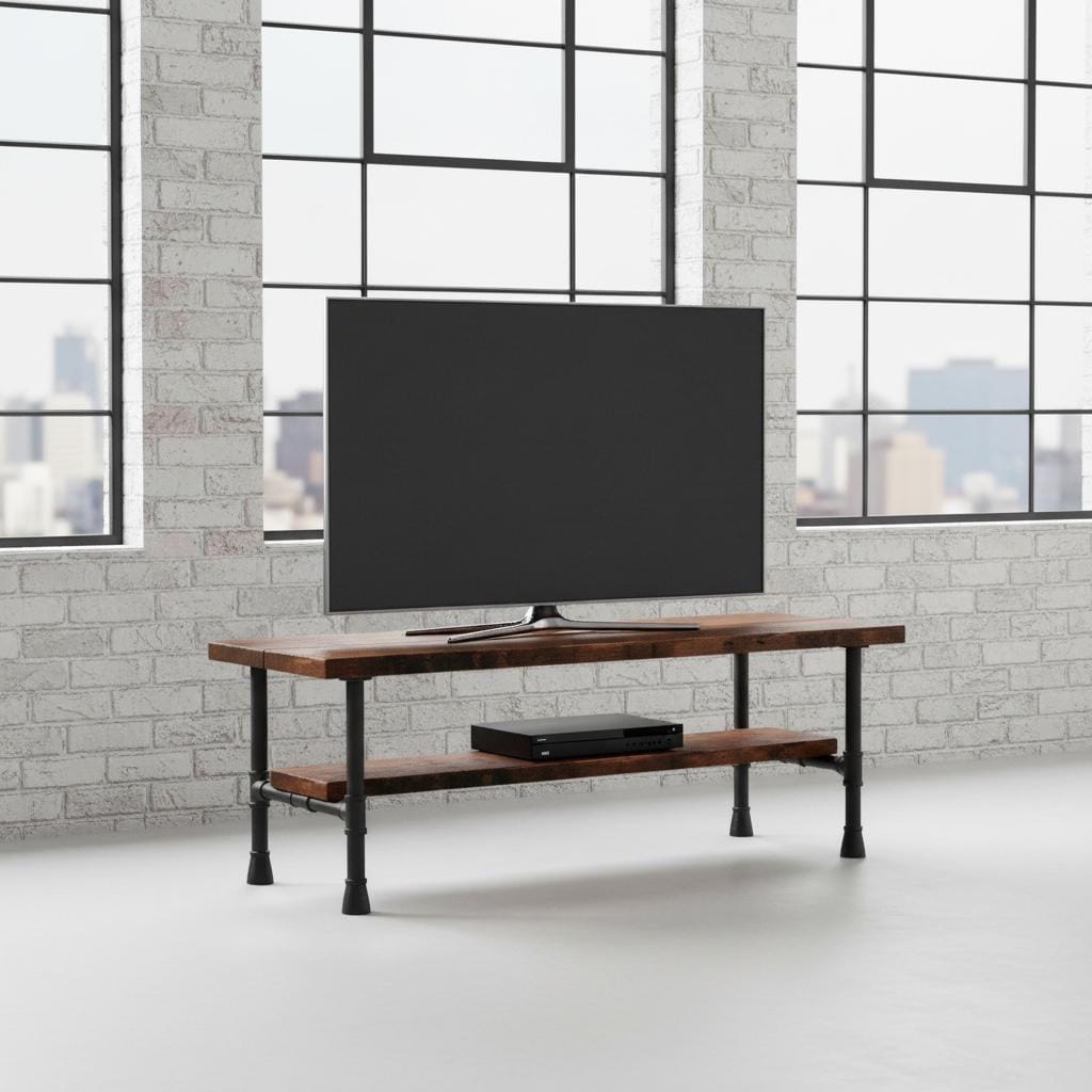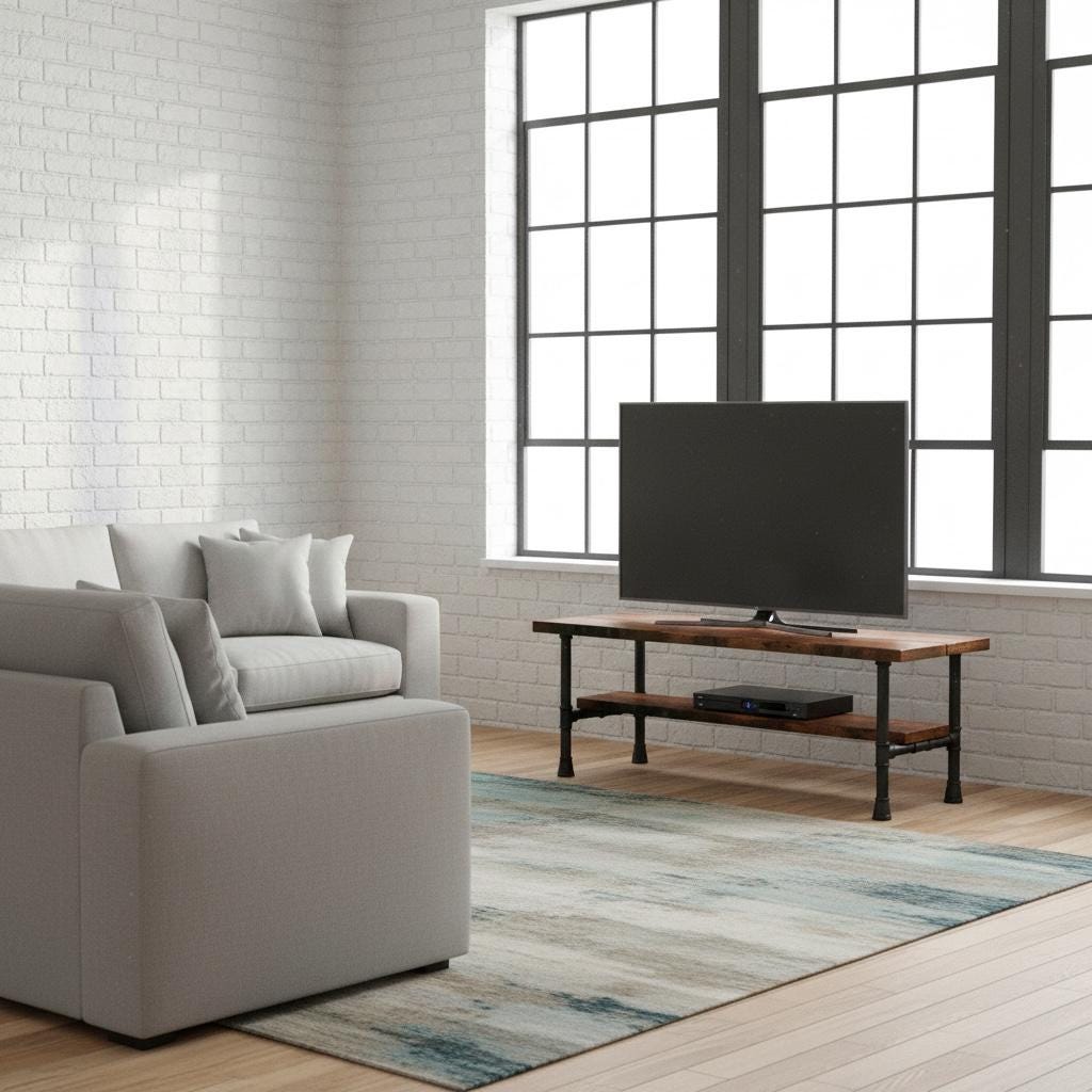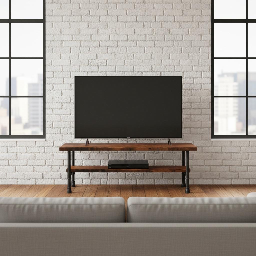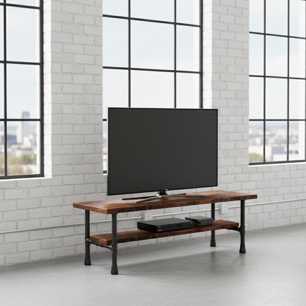 This beautiful Rustic Wood TV Stand features a unique steel leg frame topped off with a thick 1.5" solid wood surface. The desk top is handcrafted from carefully selected timber, chosen for characteristics such as knots, variable grain patterns, saw marks, nail holes, dents and distressed details, as well as many other unique characteristics. Each piece is handled with care and crafted with hours of skillful labor. Like crafting a piece of artwork, the wood is sawed, shaped and sanded to form this beautiful treasure. The surface also features approximately one-half inch V-shaped grooves along each joined board edge to provide a rustic plank board feel and appearance. A full array of rich finishes and colors are available for your choosing. All finishes are hand applied and top coated with a water based polyurethane. Order your very own piece of handcrafted furniture today!