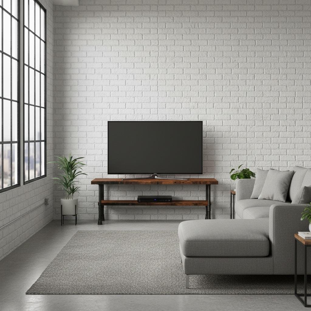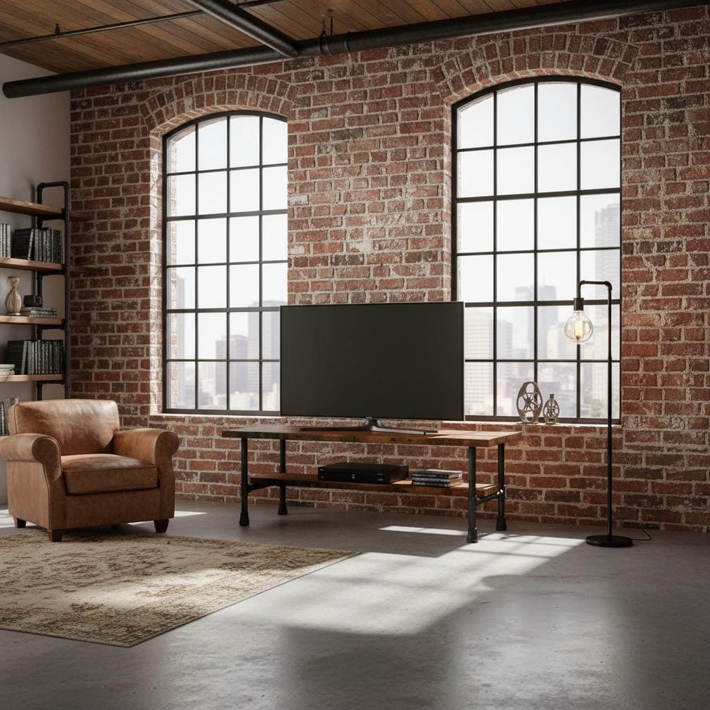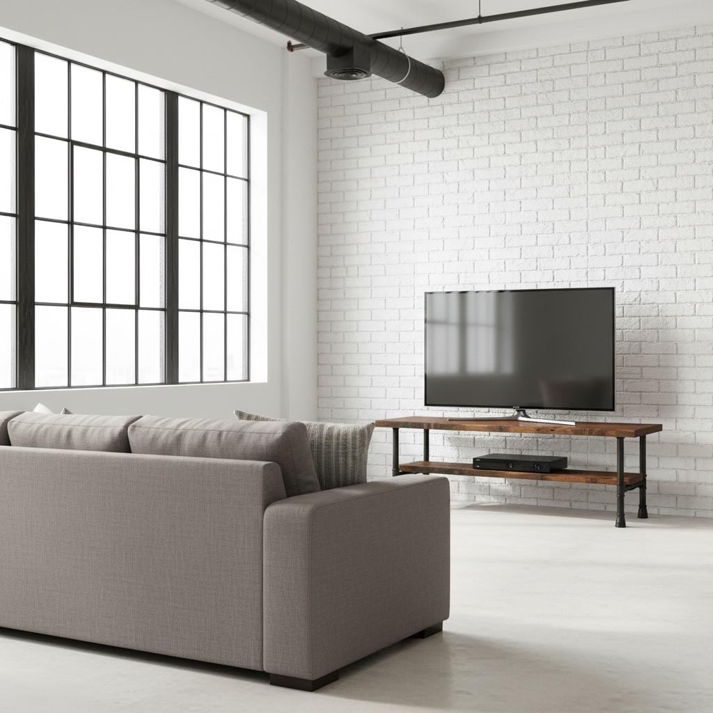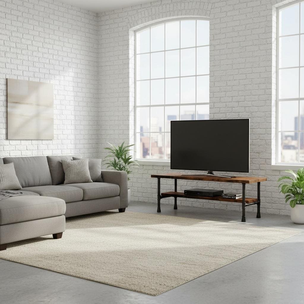 This beautiful Rustic Wood TV Stand features a unique steel leg frame topped off with a thick 1.5" solid wood surface. The desk top is handcrafted from carefully selected timber, chosen for characteristics such as knots, variable grain patterns, saw marks, nail holes, dents and distressed details, as well as many other unique characteristics. Each piece is handled with care and crafted with hours of skillful labor. Like crafting a piece of artwork, the wood is sawed, shaped and sanded to form this beautiful treasure. The surface also features approximately one-half inch V-shaped grooves along each joined board edge to provide a rustic plank board feel and appearance. A full array of rich finishes and colors are available for your choosing. All finishes are hand applied and top coated with a water based polyurethane. Order your very own piece of handcrafted furniture today!