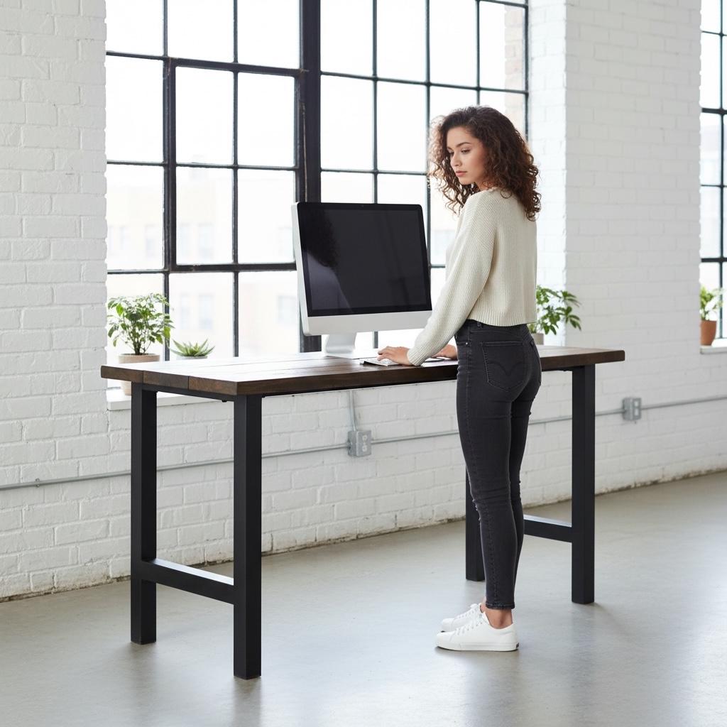 This beautiful Rustic Wood Standing Desk features steel legs topped off with a thick 1.5" solid wood surface. The wood top is handcrafted from carefully selected timber, chosen for characteristics such as knots, variable grain patterns, saw marks, nail holes, dents and distressed details, as well as many other unique characteristics. Each piece is handled with care and crafted with hours of skillful labor. Like crafting a piece of artwork, the wood is sawed, shaped and sanded to form this beautiful treasure. The surface also features approximately one-half inch V-shaped grooves along each joined board edge to provide a rustic plank board feel and appearance. A full array of rich finishes and colors are available for your choosing. All finishes are hand applied and top coated with a water based polyurethane. Order your very own piece of handcrafted furniture today!