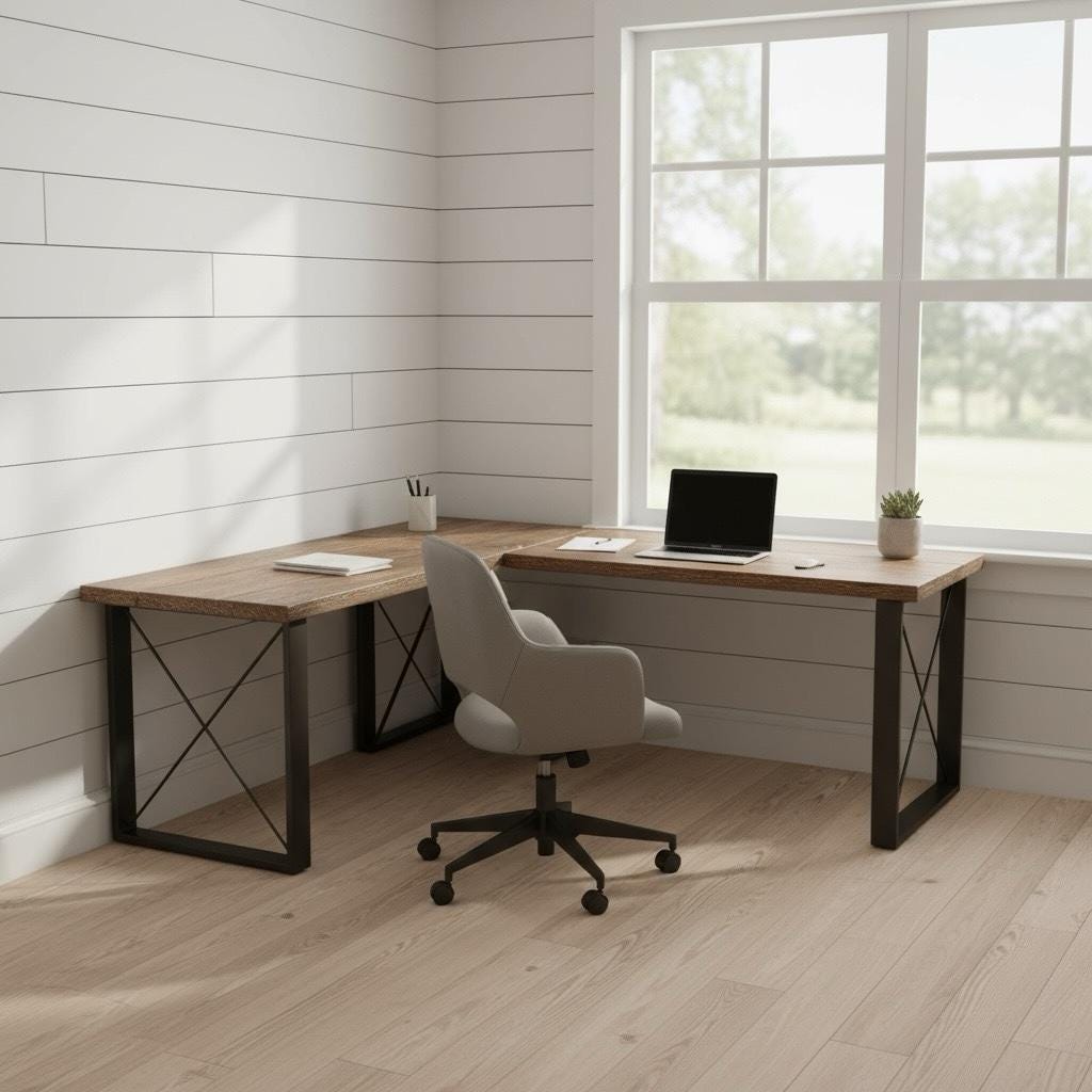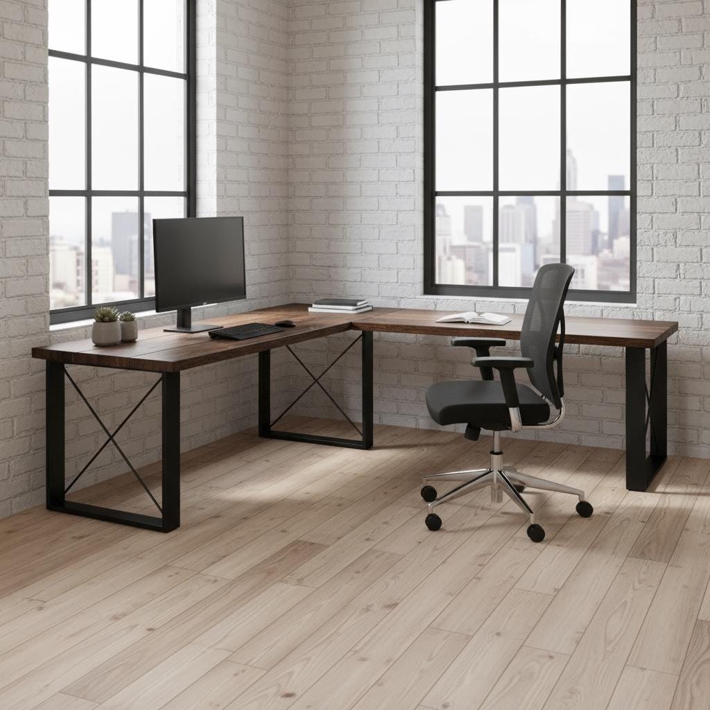 SQUARE-X LEG / L-SHAPED RUSTIC WOOD & STEEL DESK