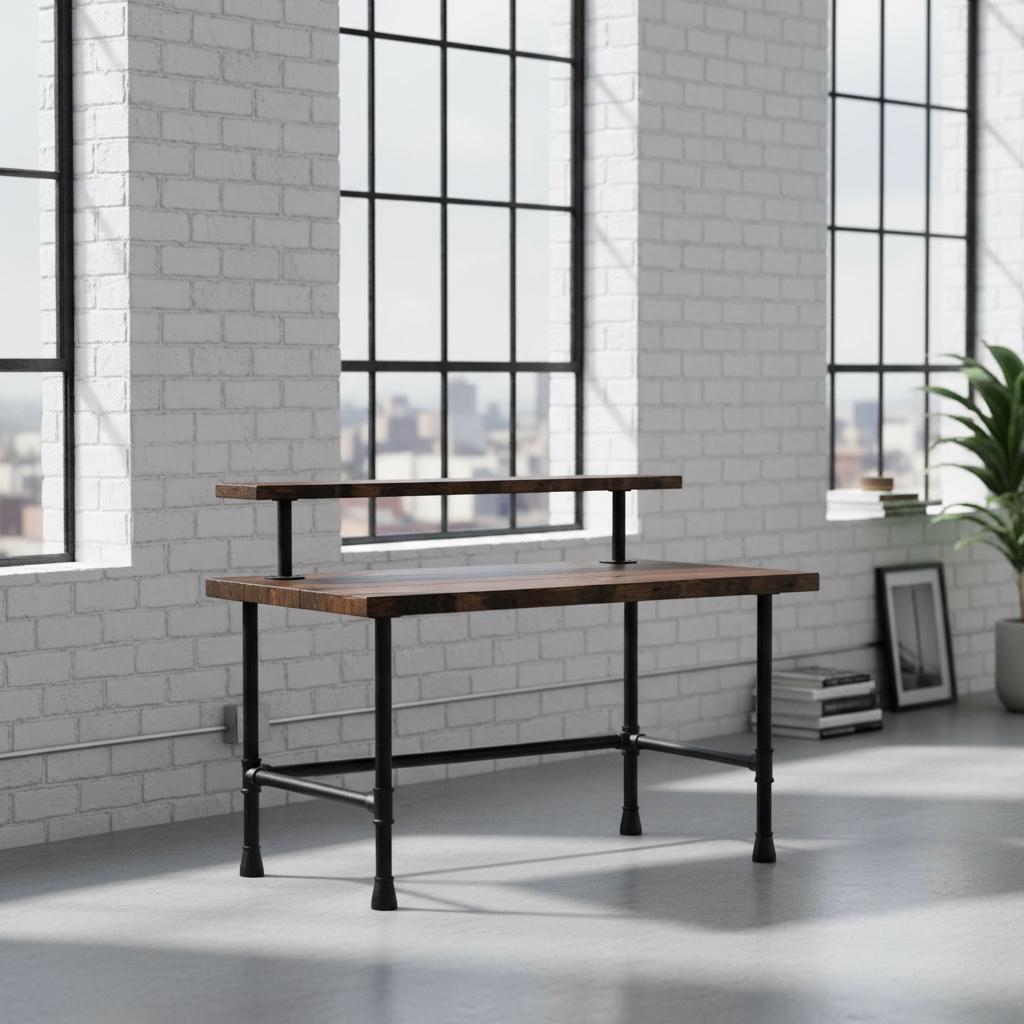 RUSTIC WOOD & PIPE DESK with an ELEVATED SHELF