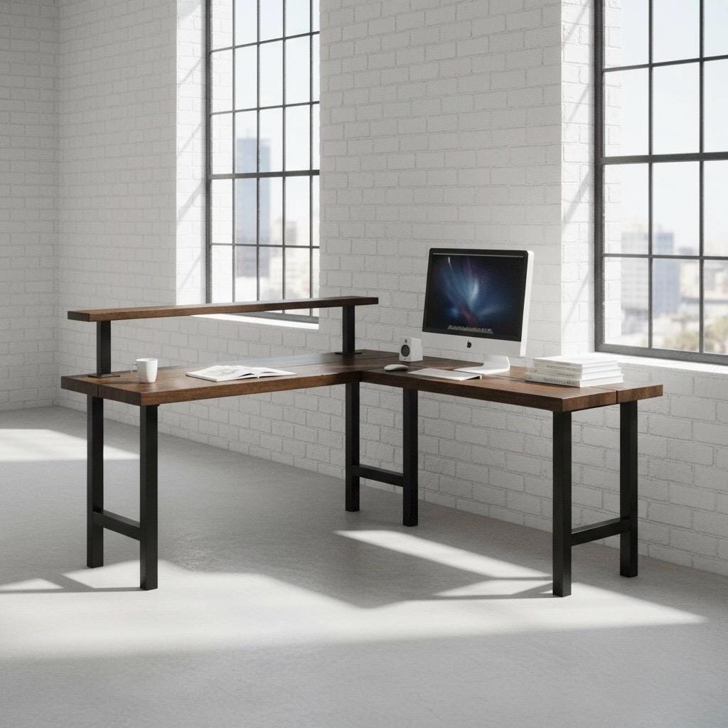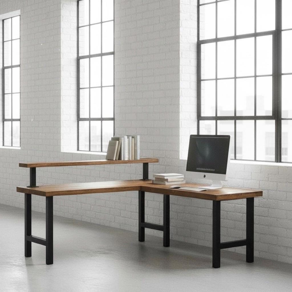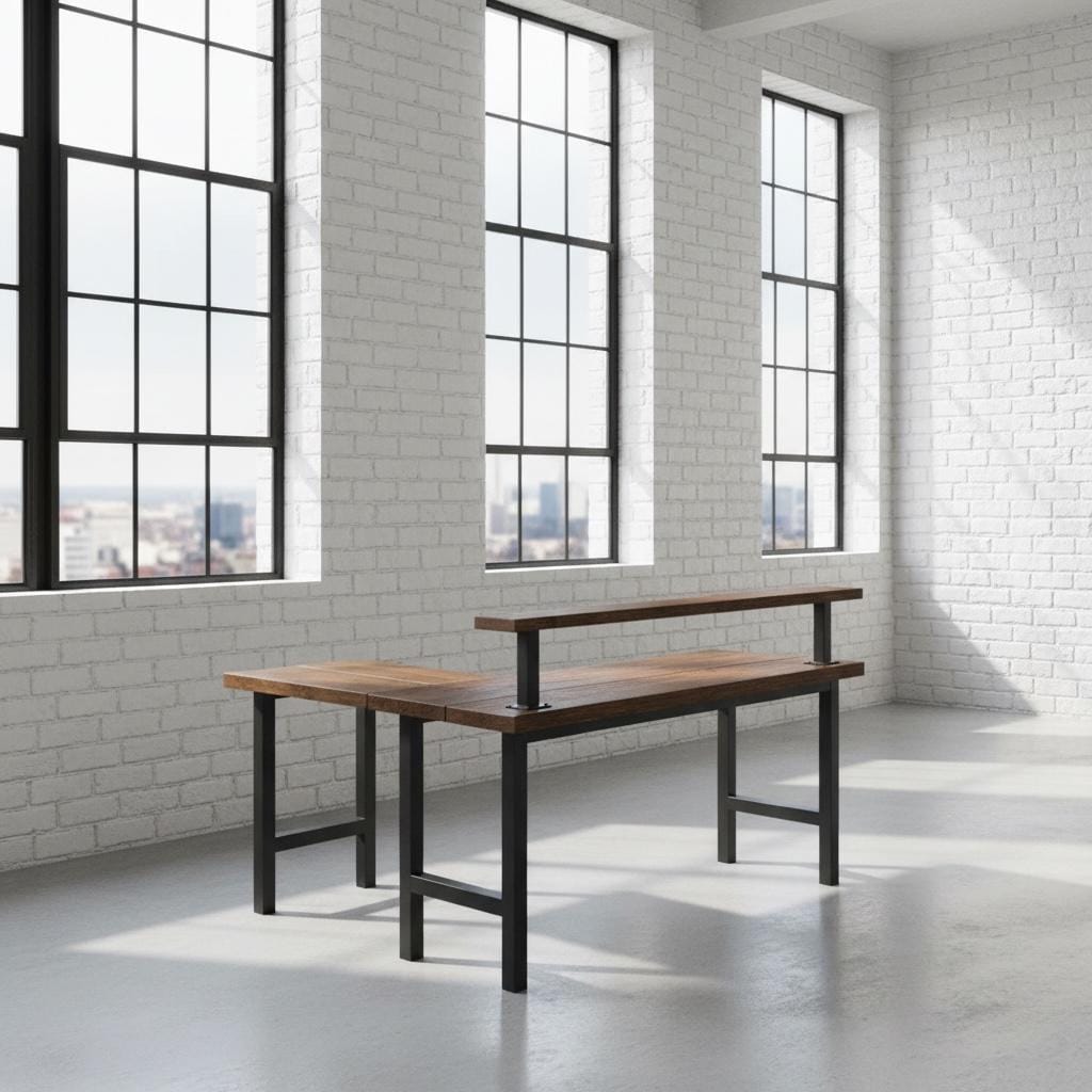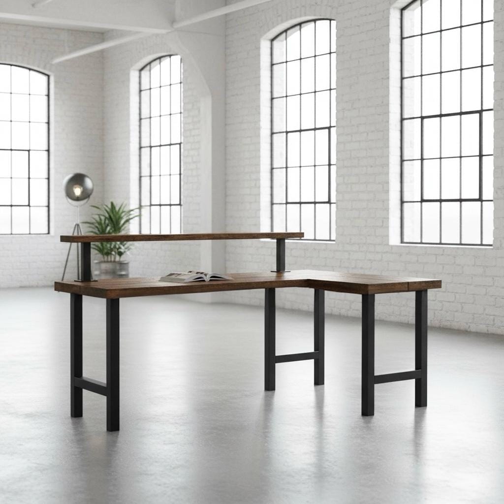 L-SHAPED RUSTIC WOOD & STEEL DESK STATION (30" Desk surface height)