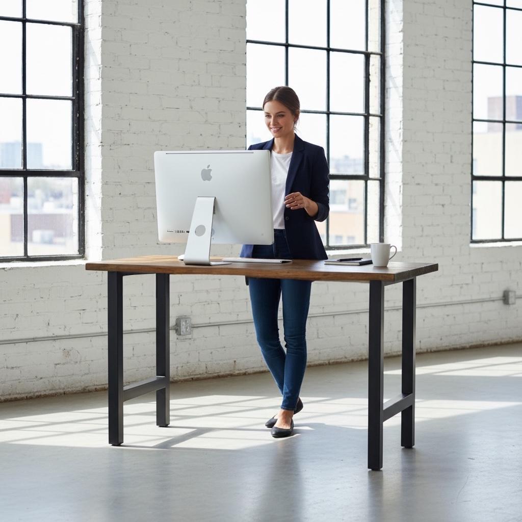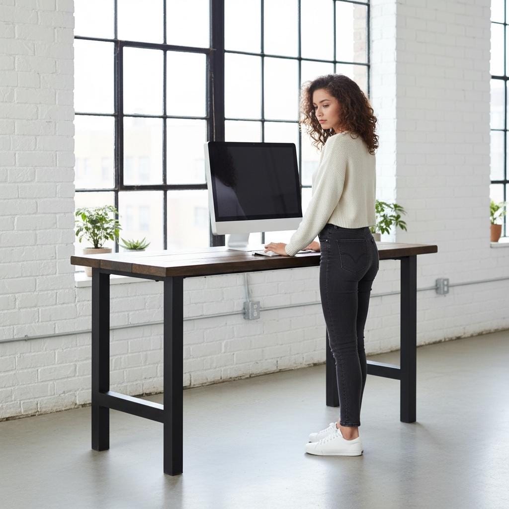 This beautiful Rustic Wood Standing Desk features steel legs topped off with a thick 1.5" solid wood surface. The wood top is handcrafted from carefully selected timber, chosen for characteristics such as knots, variable grain patterns, saw marks, nail holes, dents and distressed details, as well as many other unique characteristics. Each piece is handled with care and crafted with hours of skillful labor. Like crafting a piece of artwork, the wood is sawed, shaped and sanded to form this beautiful treasure. The surface also features approximately one-half inch V-shaped grooves along each joined board edge to provide a rustic plank board feel and appearance. A full array of rich finishes and colors are available for your choosing. All finishes are hand applied and top coated with a water based polyurethane. Order your very own piece of handcrafted furniture today!
