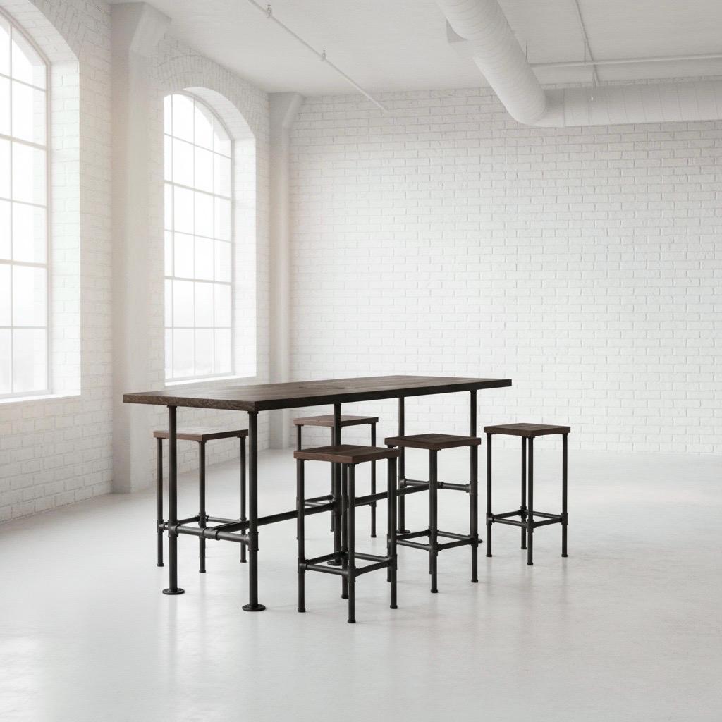 This beautiful Rustic Wood Bar Table features industrial steel pipe legs topped off with a thick 1.5" solid wood surface. The wood top is handcrafted from carefully selected timber, chosen for characteristics such as knots, variable grain patterns, saw marks, nail holes, dents and distressed details, as well as many other unique characteristics. Each piece is handled with care and crafted with hours of skillful labor. Like crafting a piece of artwork, the wood is sawed, shaped and sanded to form this beautiful treasure. The surface also features approximately one-half inch V-shaped grooves along each joined board edge to provide a rustic plank board feel and appearance. A full array of rich finishes and colors are available for your choosing. All finishes are hand applied and top coated with a water based polyurethane. Order your very own piece of handcrafted furniture today!