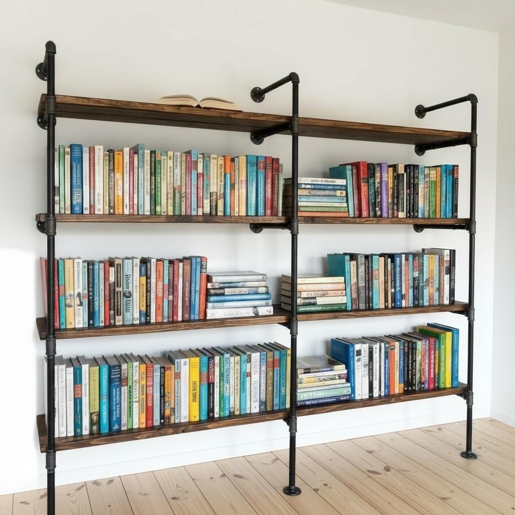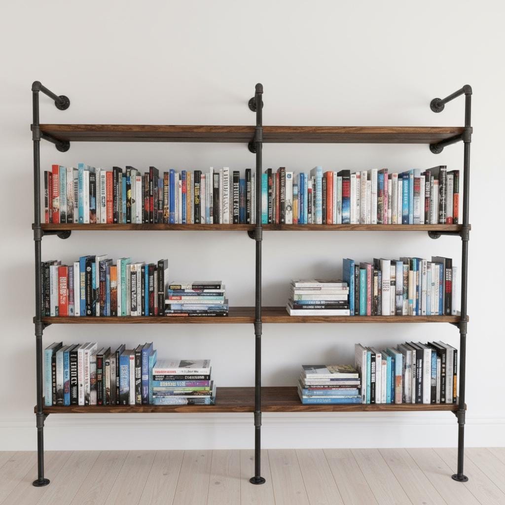 Our Wall Shelving Unit features industrial steel pipe with thick solid wood shelving. The rough-sawn wood is handcrafted from carefully selected timber, chosen for characteristics such as knots, variable grain patterns, saw marks, nail holes, dents and distressed details, as well as many other unique characteristics.