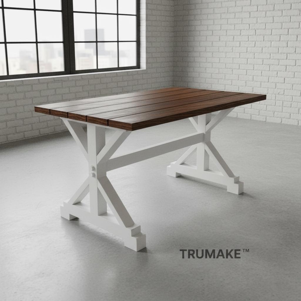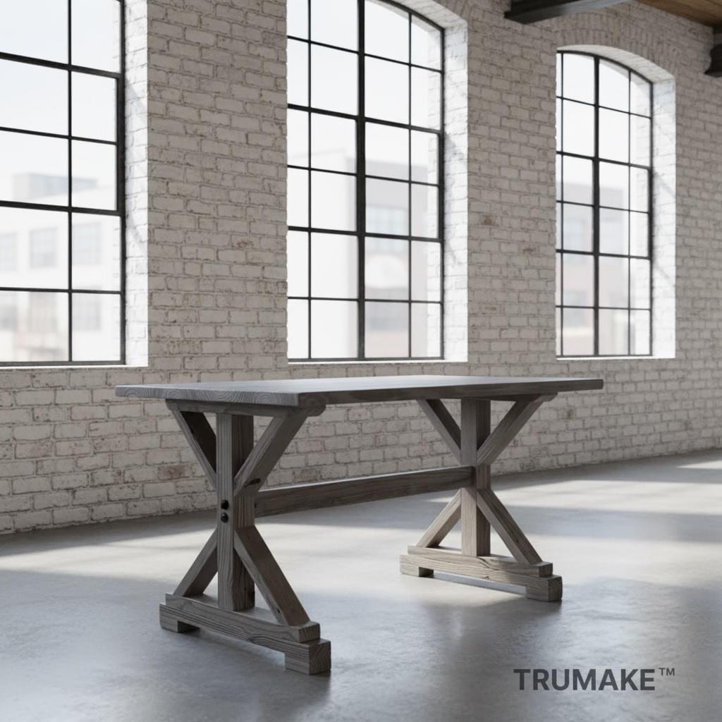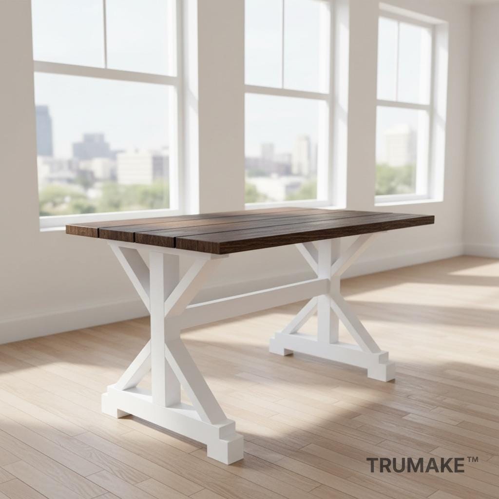 Our beautiful Rustic Wood Table features solid wood Trestle Legs with a thick 1.5" solid wood surface. The table top is handcrafted from carefully selected timber, chosen for characteristics such as knots, variable grain patterns, saw marks, nail holes, dents and distressed details, as well as many other unique characteristics.