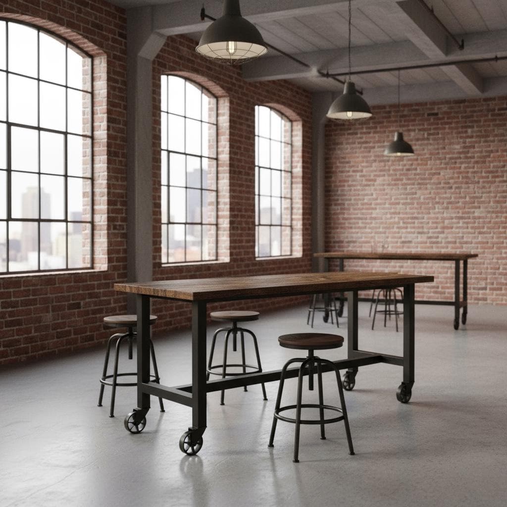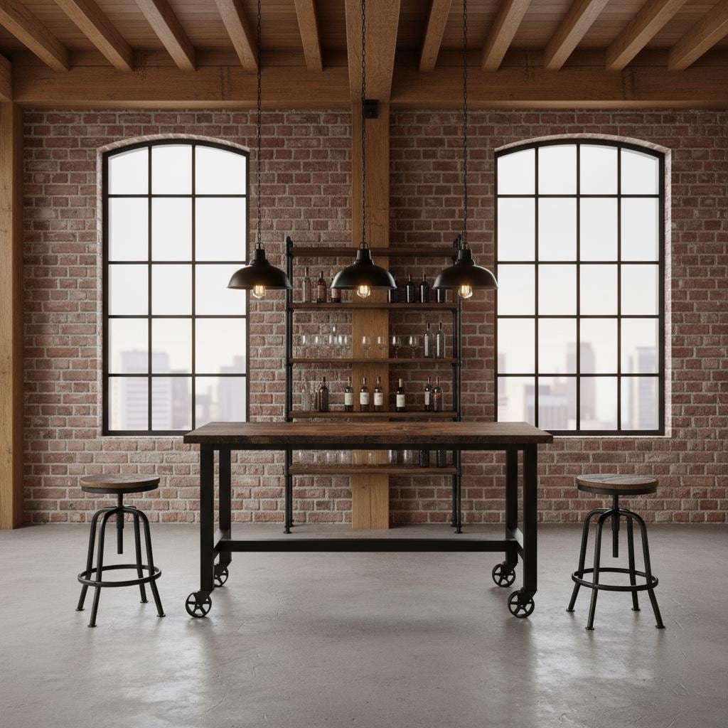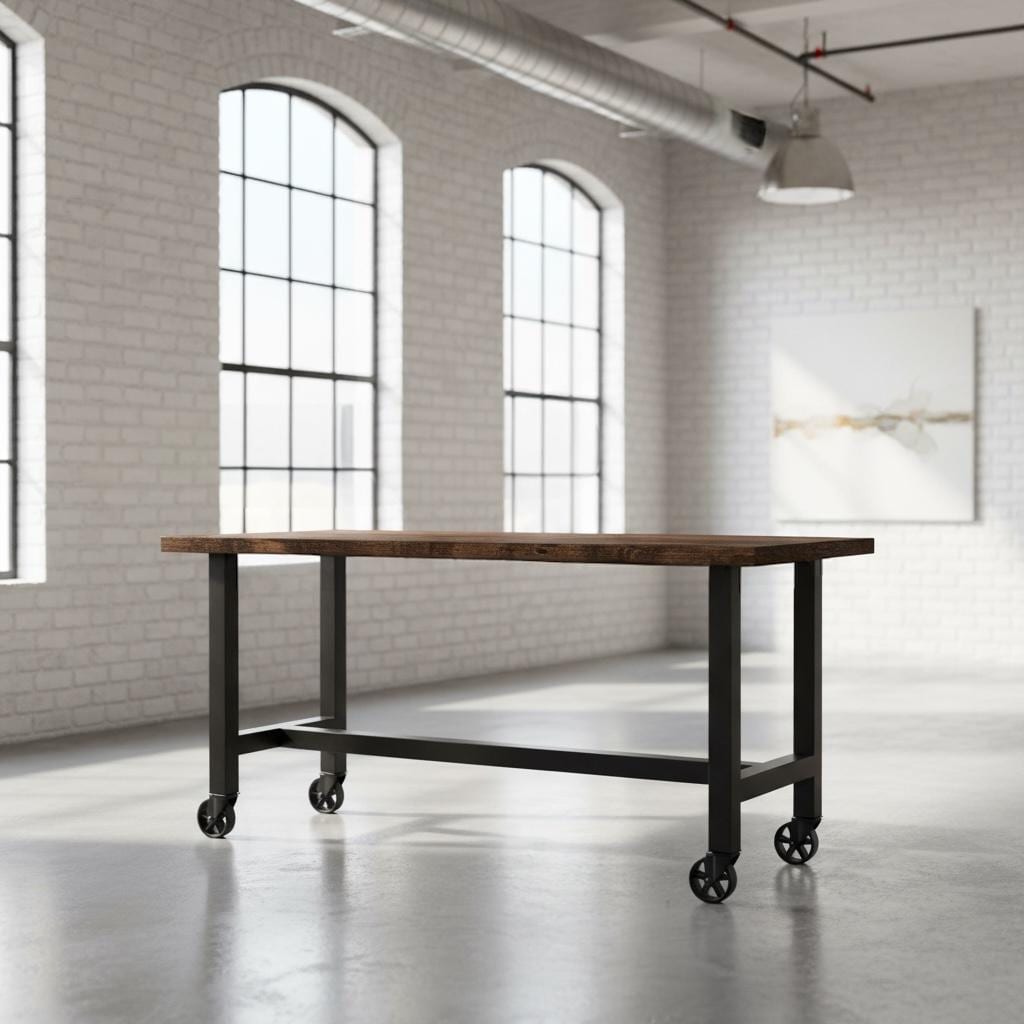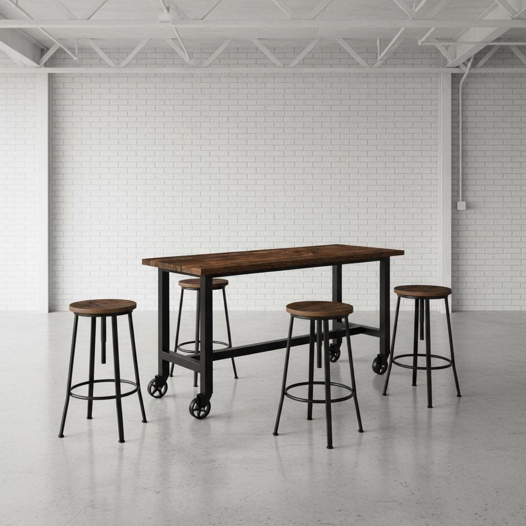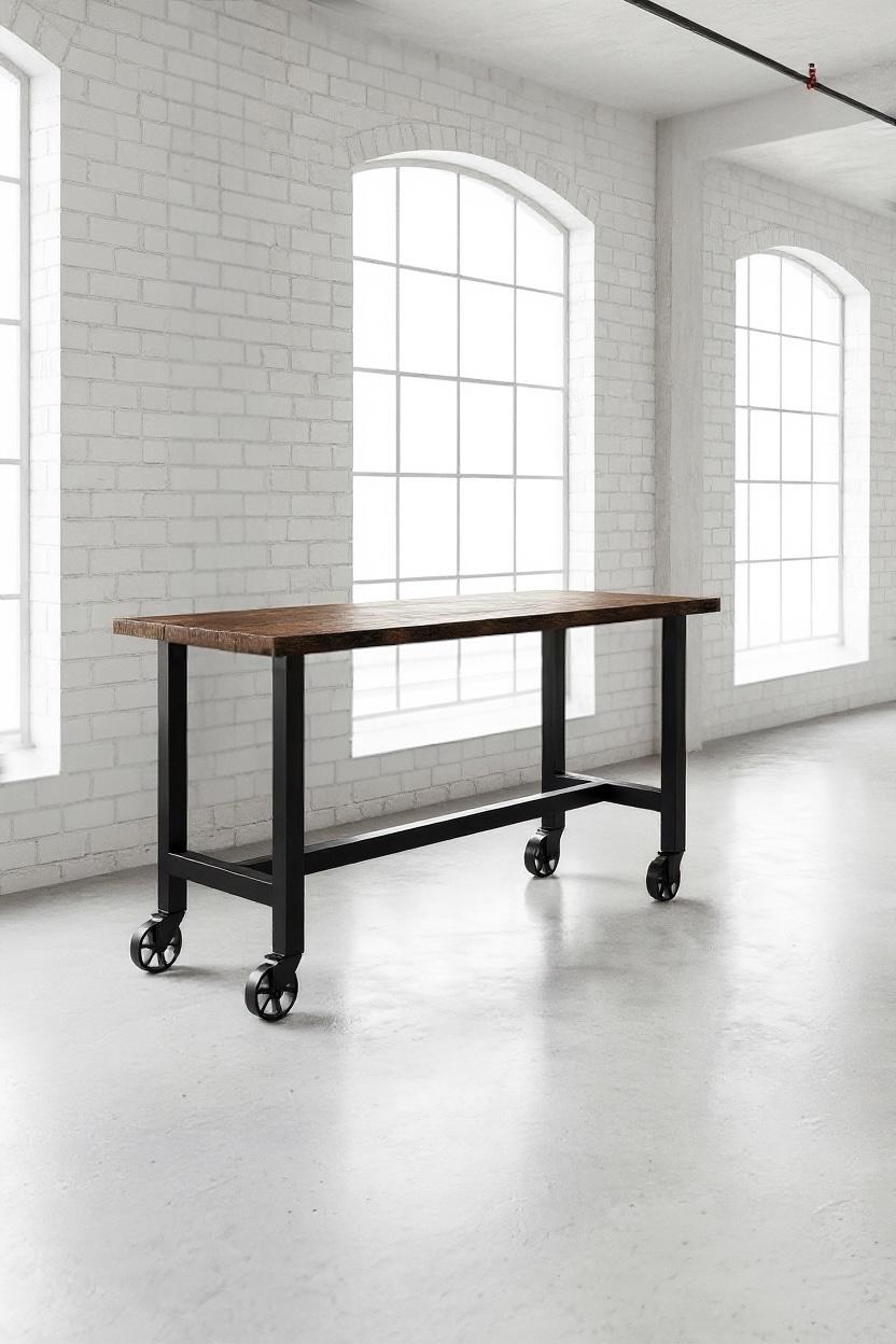 • TRUMAKE™ RUSTIC WOOD & STEEL BAR TABLE with Locking Caster Wheels